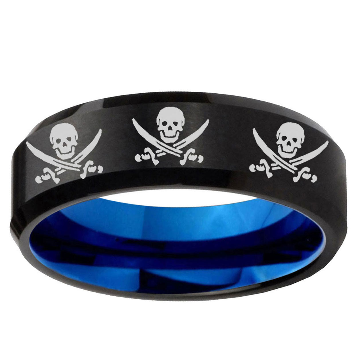 Intruding 5, 8mm Multiple Skull Pirate Beveled Blue and Black Tungsten Men's Promise Ring . Offer in both 5mm and 8mm band width Blue and Black finished from Size 4 to 14
