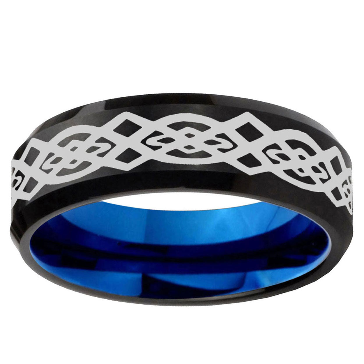 Intruding 5, 8mm Celtic Knot Beveled Edge Blue and Black Tungsten Carbide Men's Ring . Offer in both 5mm and 8mm band width Blue and Black finished from Size 4 to 14