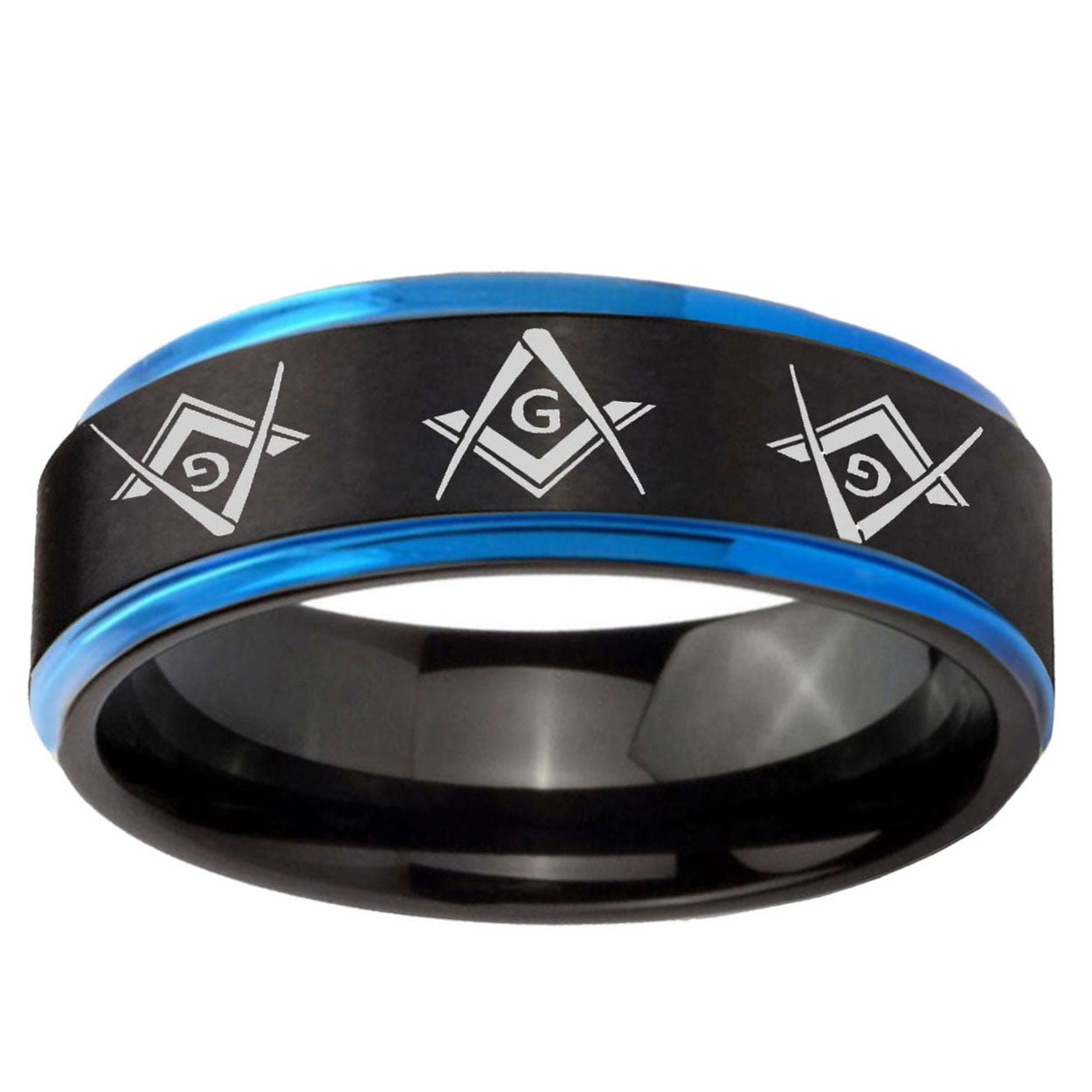 Intruding 5, 8mm Master Mason Masonic Blue Step Edge Black Tungsten Men's Bands Ring . Offer in both 5mm and 8mm band width black plated finished from size 4 to 14