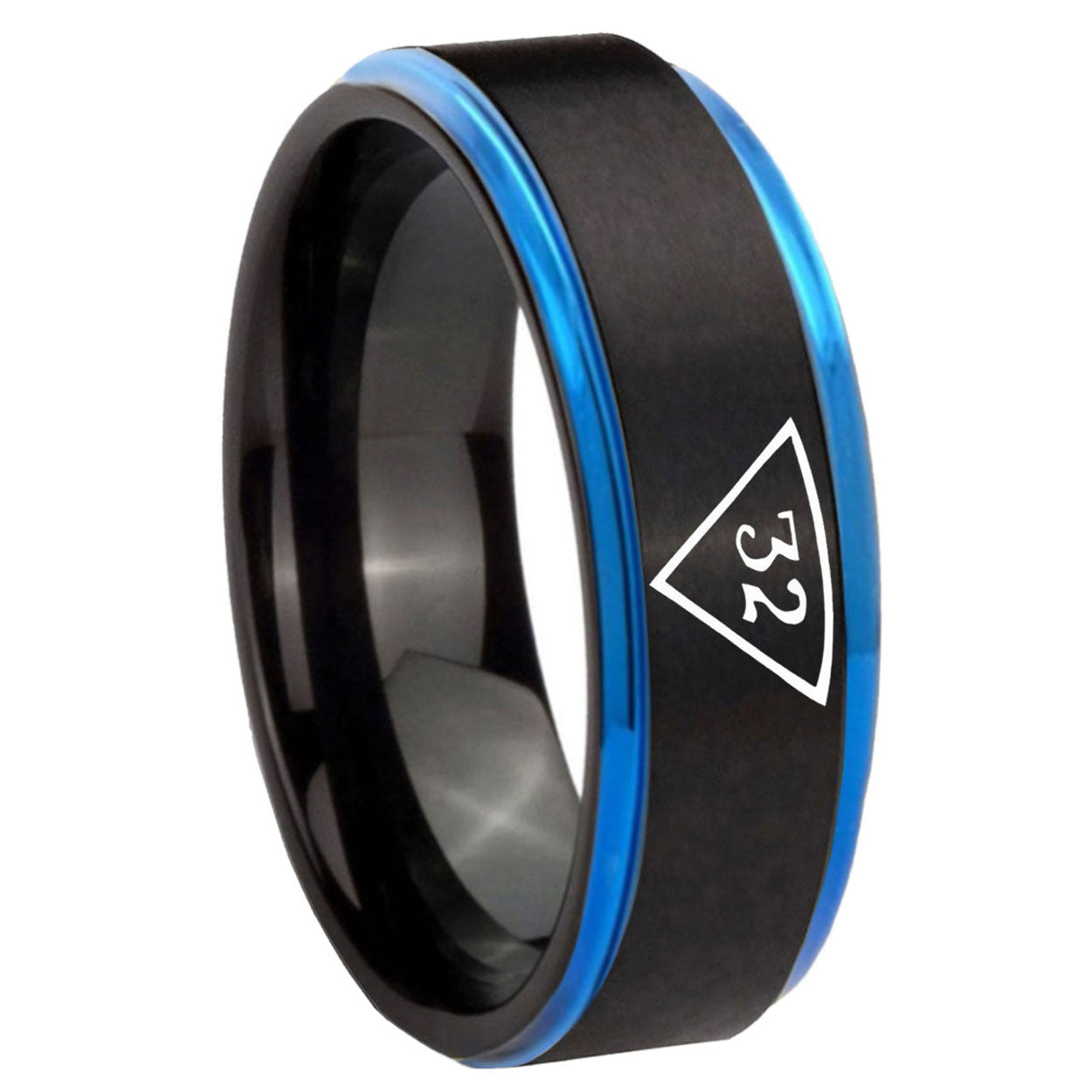 5, 8mm Masonic 32 Triangle Freemason Blue Step Edge Black Tungsten Carbide Custom Mens Ring