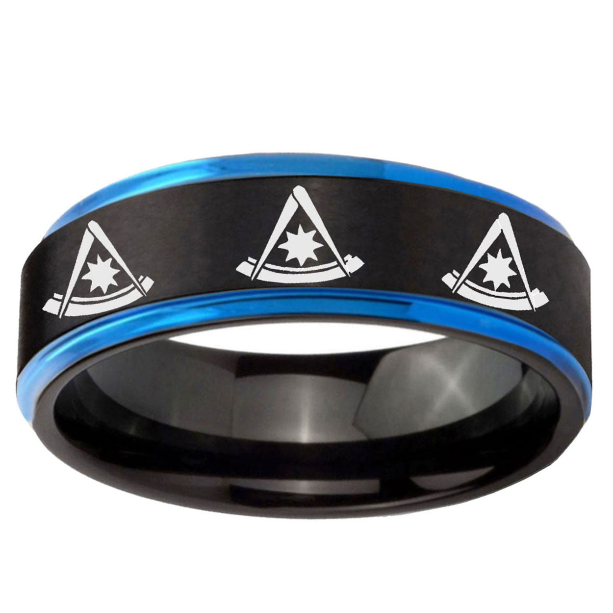 5, 8mm Multiple Pester Master Masonic Blue Step Edge Black Tungsten Men's Ring