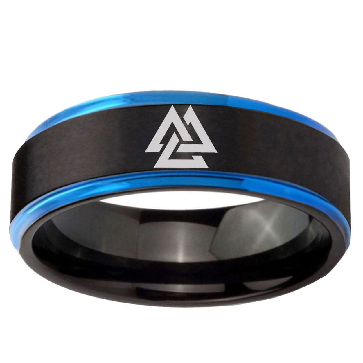 Intruding 5, 8mm Viking Symbol Blue Step Edge Black Tungsten Carbide Mens Ring . Offer in both 5mm and 8mm band width brushed black plated finished from size 4 to 14