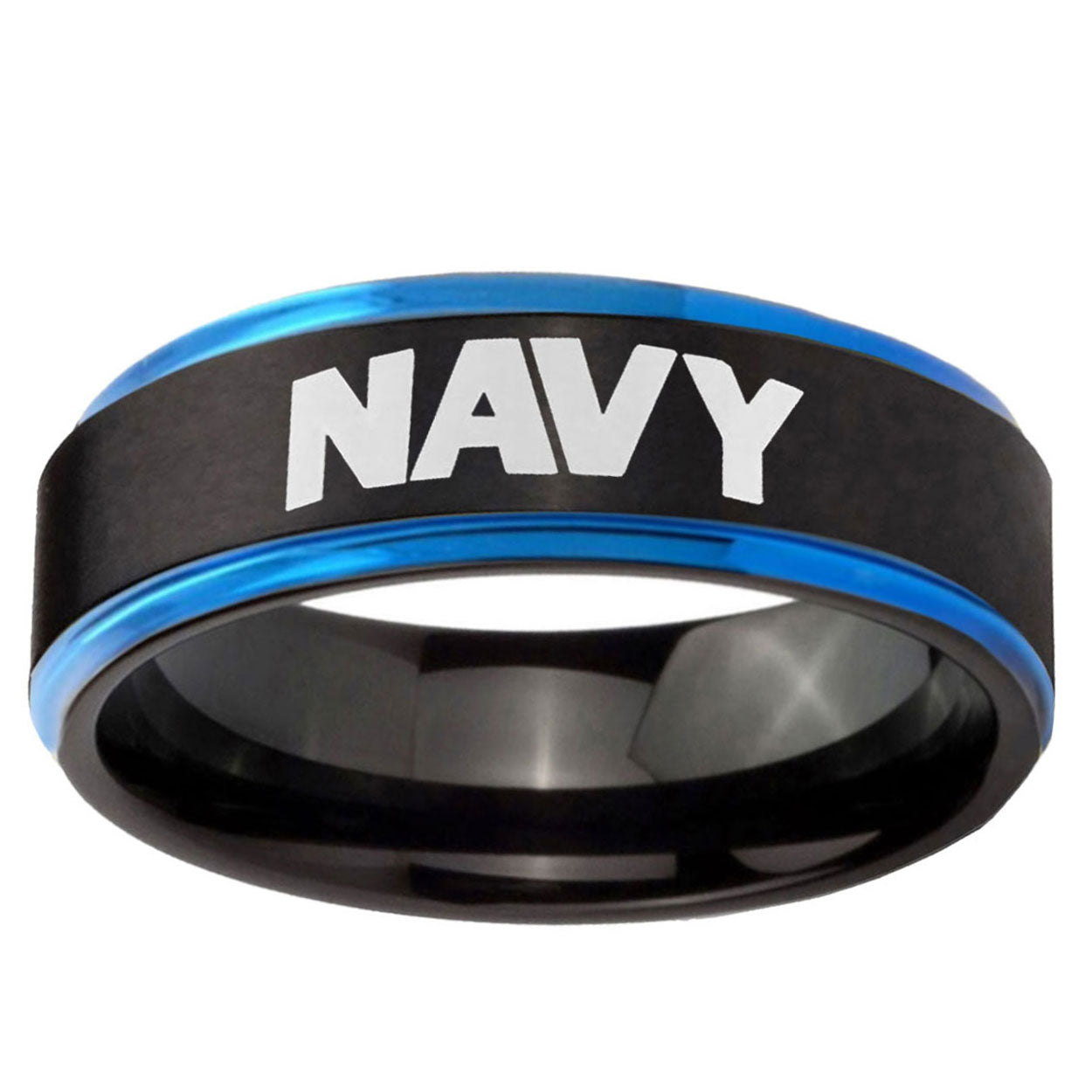 Intruding 5, 8mm Navy Blue Step Edge Black Tungsten Carbide Men's Wedding Band . Offer in both 5mm and 8mm band width black plated finished from size 4 to 14