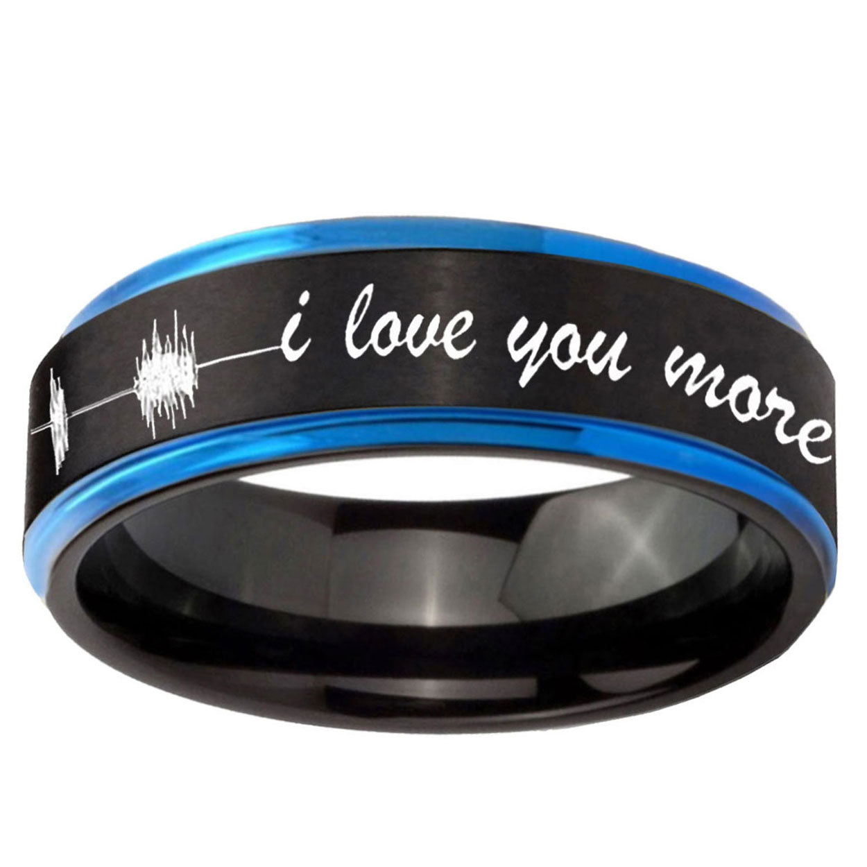 5, 8mm Sound Wave I love you more Blue Step Edge Black Tungsten Promise Ring
