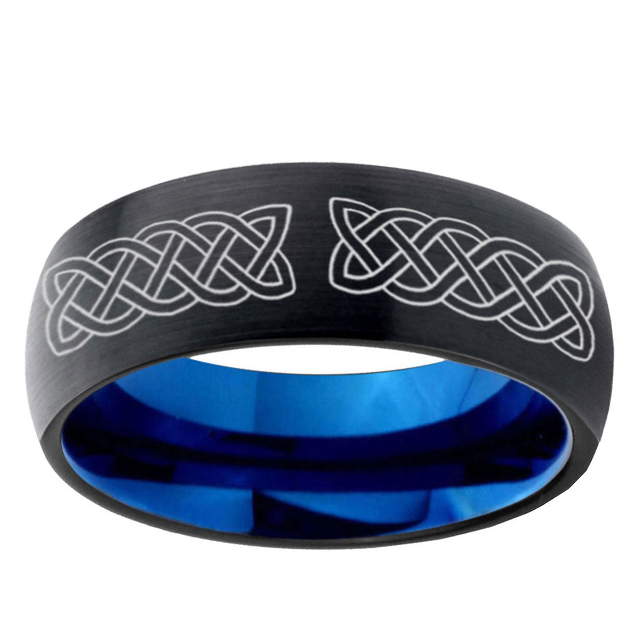 Intruding 5, 8mm Celtic Knot Dome Black And Blue Tungsten Carbide Wedding Band Ring . Offer in both 5mm and 8mm band width black and blue plated finished from size 4 to 14