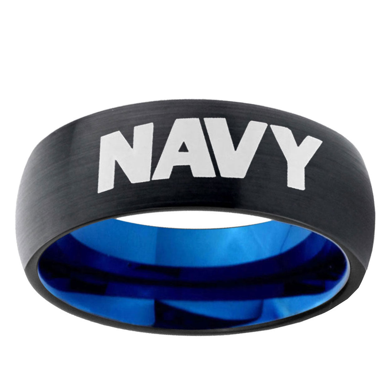 Intruding 5, 8mm Navy Dome Black And Blue Tungsten Carbide Mens Anniversary Ring . Offer in both 5mm and 8mm band width black and blue plated finished from size 4 to 14