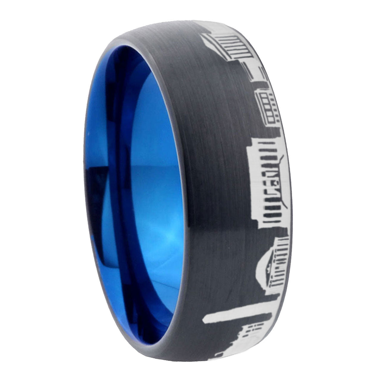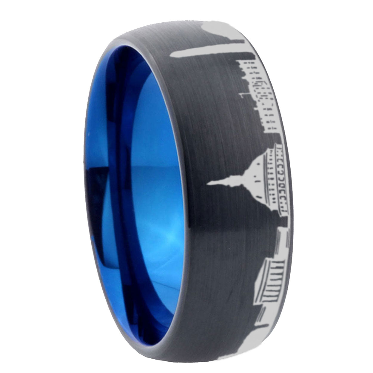 Intruding 8mm DC Washington City Dome Brushed Black Tungsten Blue Inside Mens Wedding Band. Offer in 8mm band width black and blue plated finished from size 7 to 14