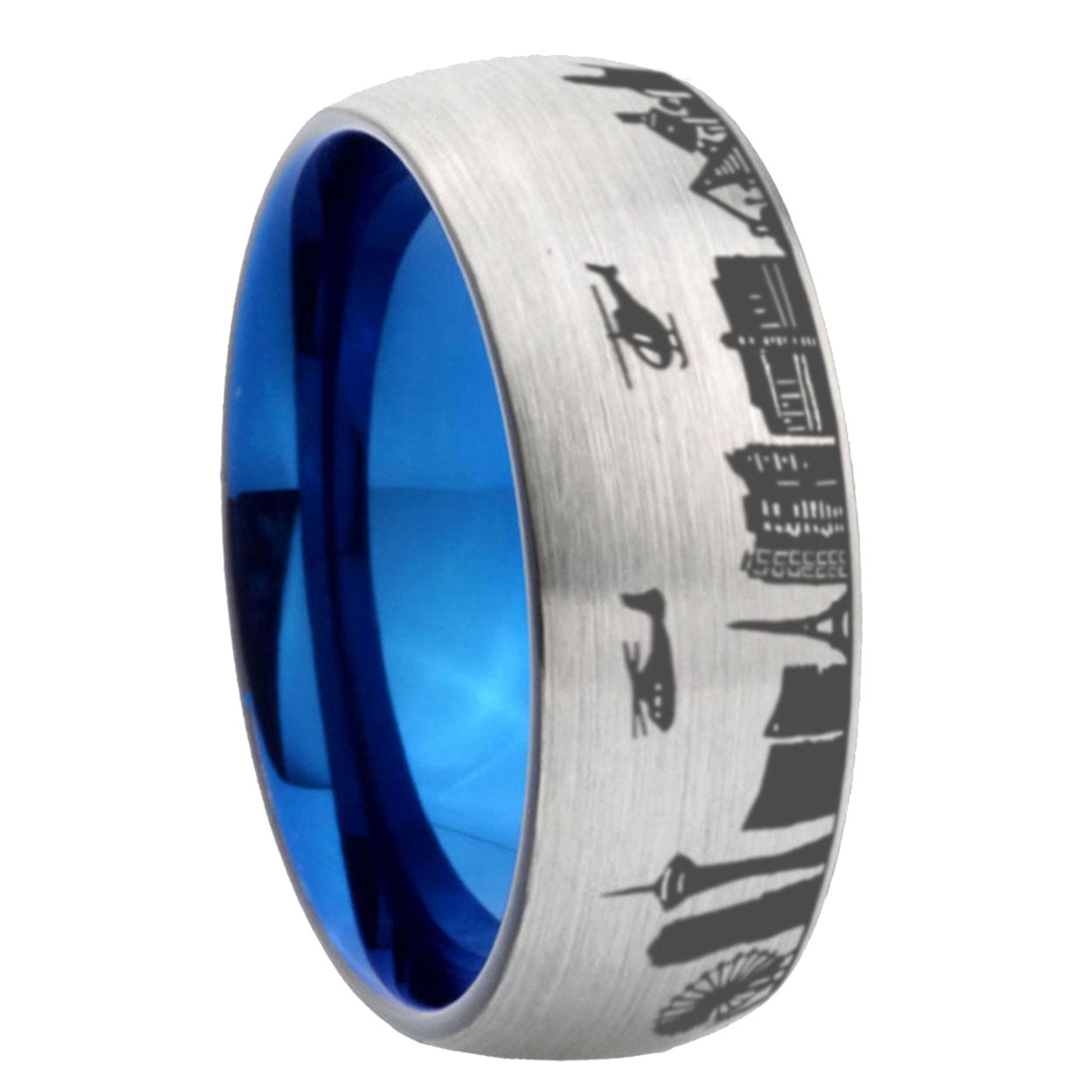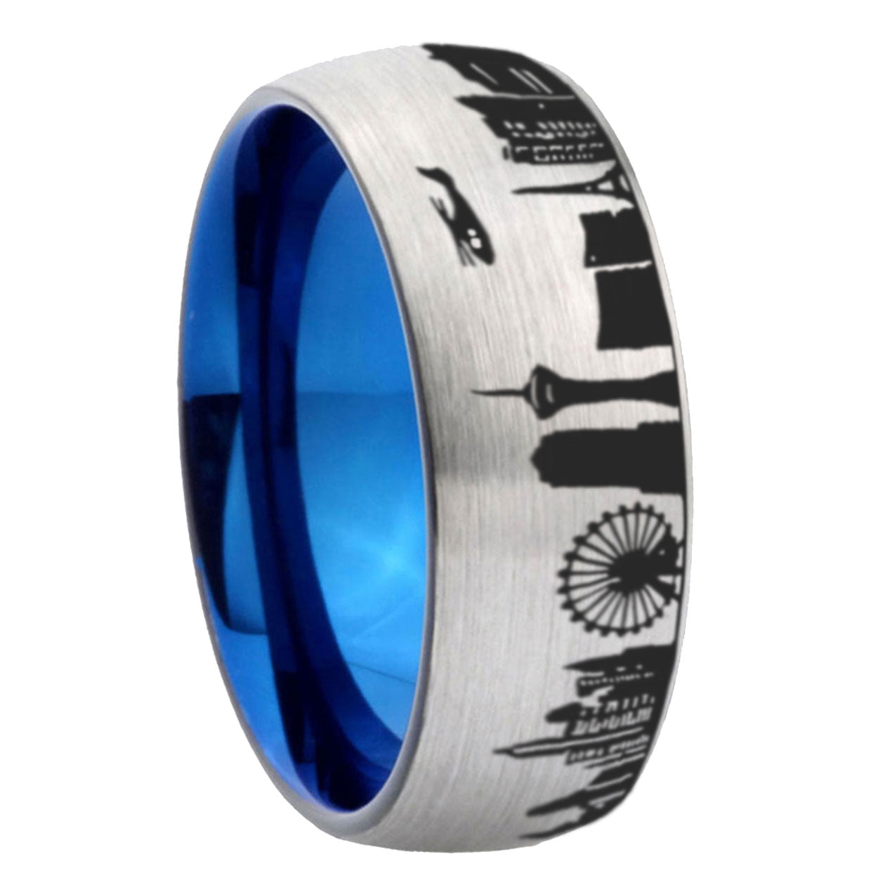 8mm LA Las Vegas City Dome Brushed Gray Tungsten Blue Plated Inside Mens Ring
