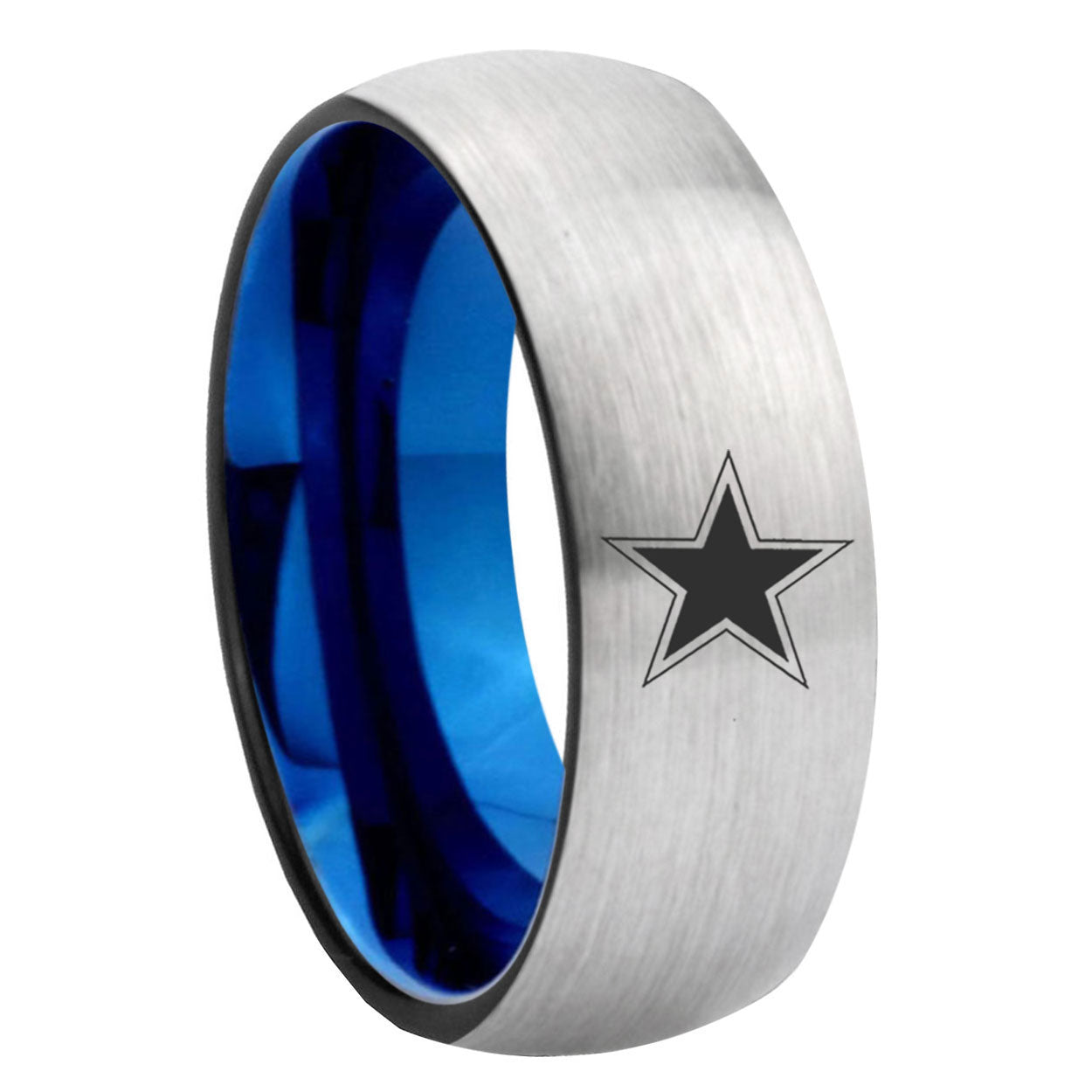 Intruding 6, 8mm Cowboys Star Dome Gray And Blue Tungsten Carbide Mens Wedding Band . Offer in both 6mm and 8mm band width gray and blue plated finished from size 5 to 14