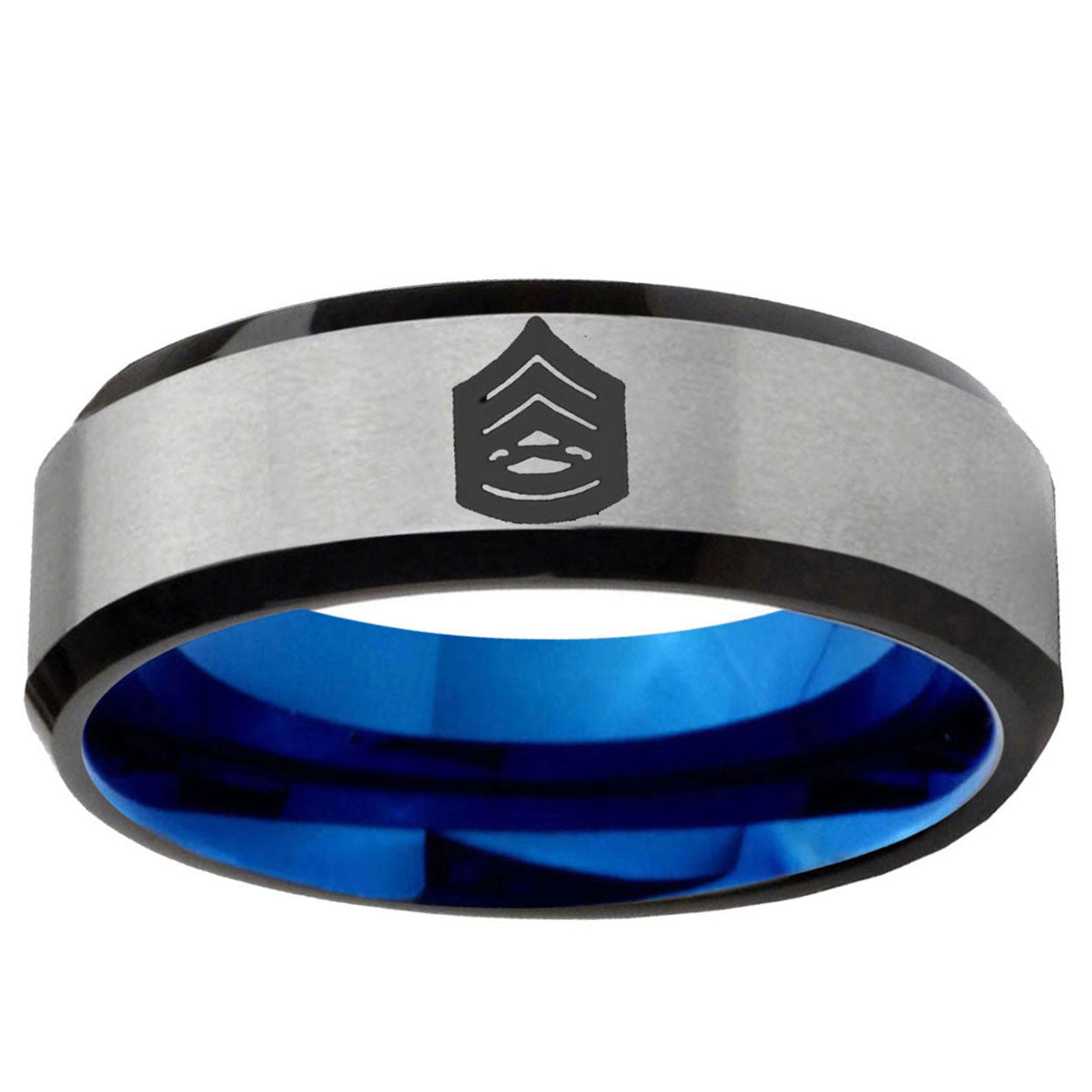 Intruding 6, 8mm Army Sergeant Major Beveled Edge Blue And Gray Tungsten Engraved Ring . Offer in both 6mm and 8mm band width Blue And Gray finished from Size 5 to 14