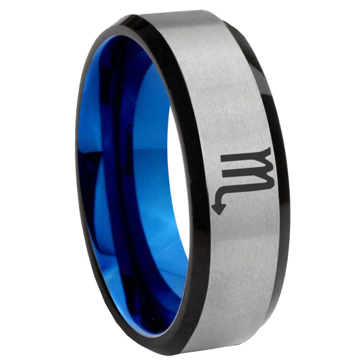 Intruding 6, 8mm Scorpio Horoscope Beveled Edge Blue And Gray Tungsten Promise Ring . Offer in both 6mm and 8mm band width Blue And Gray finished from Size 5 to 14