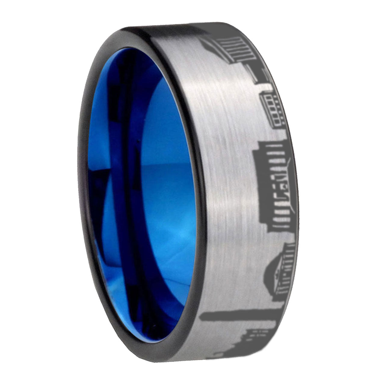 Intruding 8mm DC Washington City Pipe Cut Gray Tungsten Blue Plated Inside Promised Ring. Offer in 8mm band width brushed gray and blue plated finished from size 7 to 14