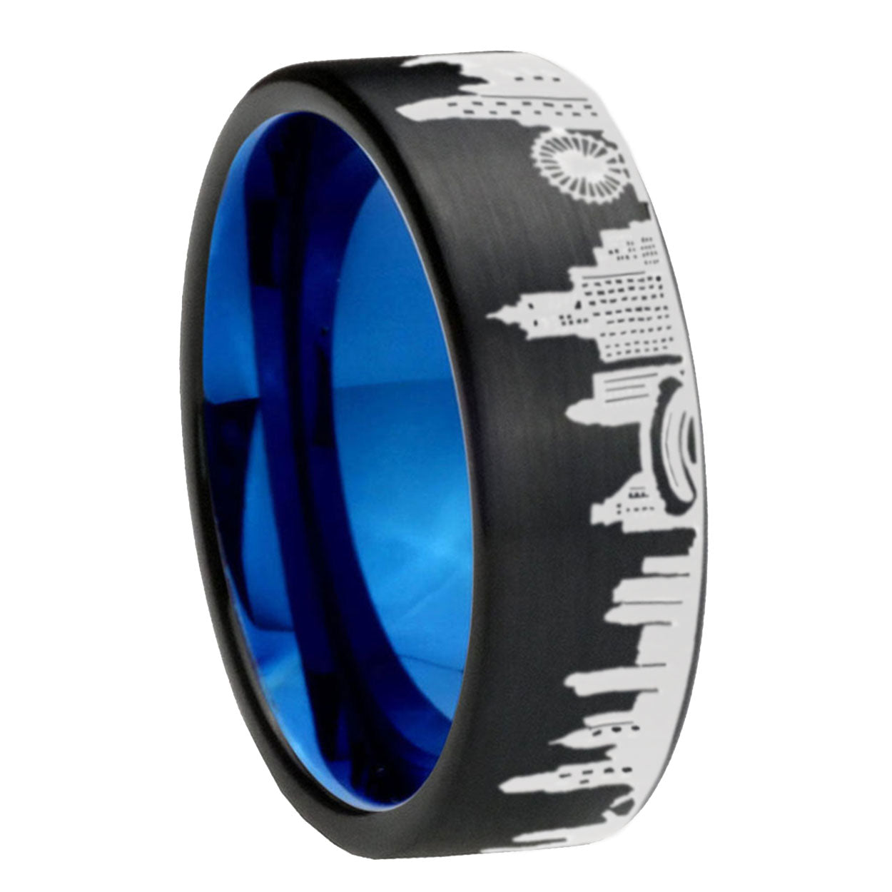 8mm Chicago City Pipe Cut Brushed Black Tungsten Blue Plated Inside Engraved Ring