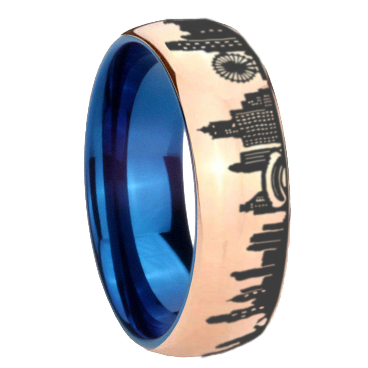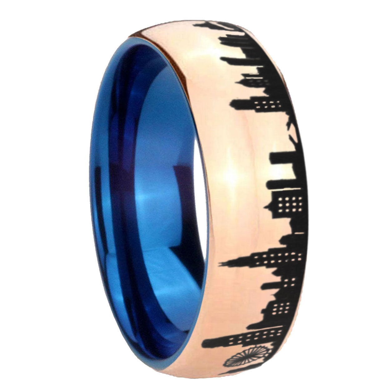 8mm Chicago City Dome Polish Rose Gold Tungsten Blue Plated Inside Mens Ring