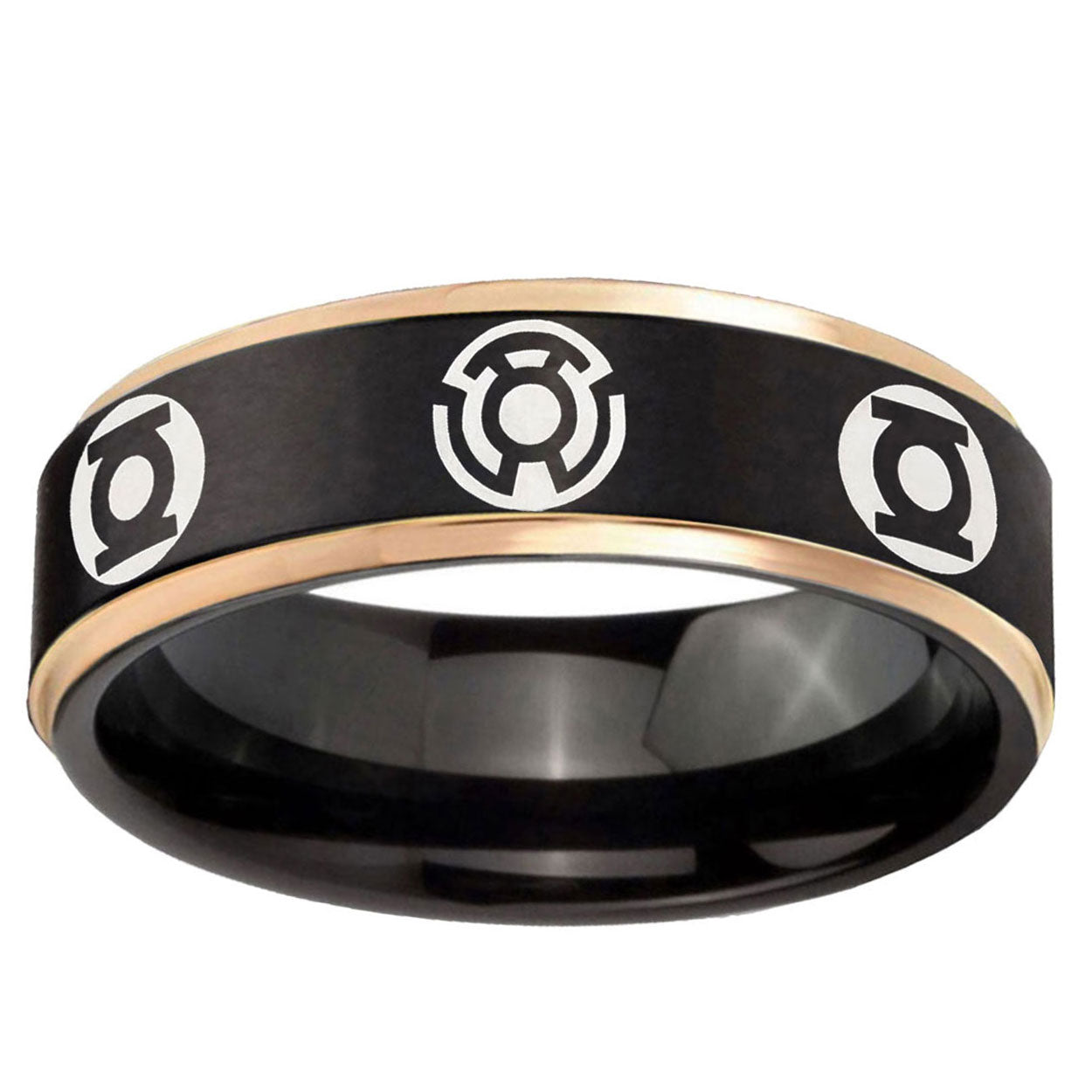 Intruding 6, 8mm Blue Green Lantern Rose Gold Step Edge Black Personalized Tungsten Rings . Offer in both 6mm and 8mm band width rose gold and black plated finished from size 6 to 14