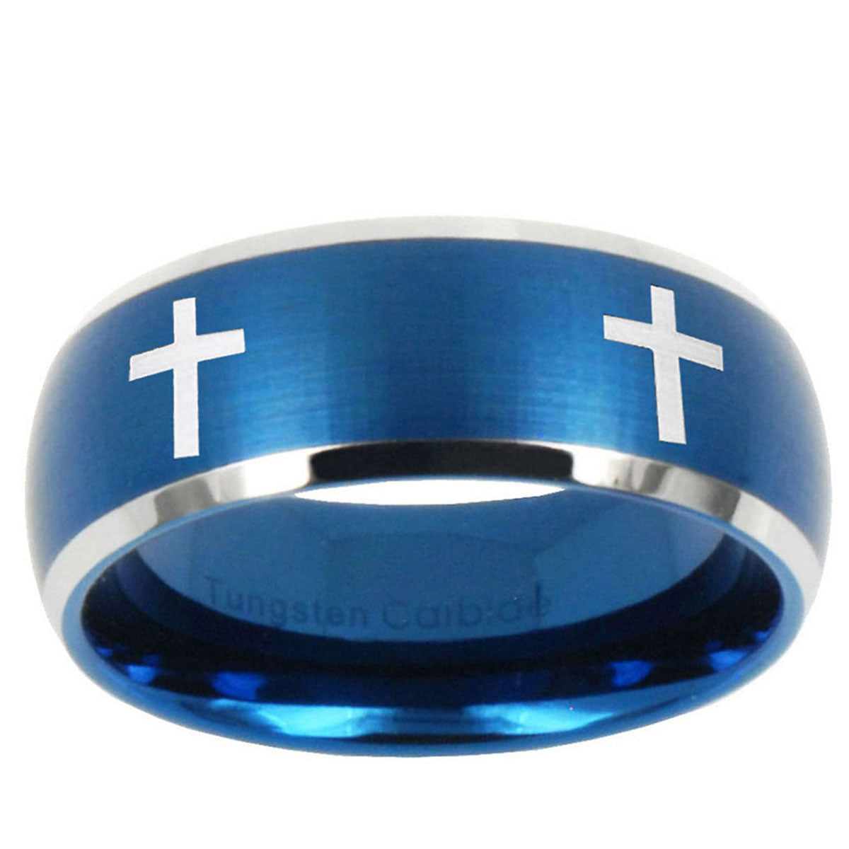 10mm Crosses Dome Brushed Blue 2 Tone Tungsten Carbide Mens Promise Ring