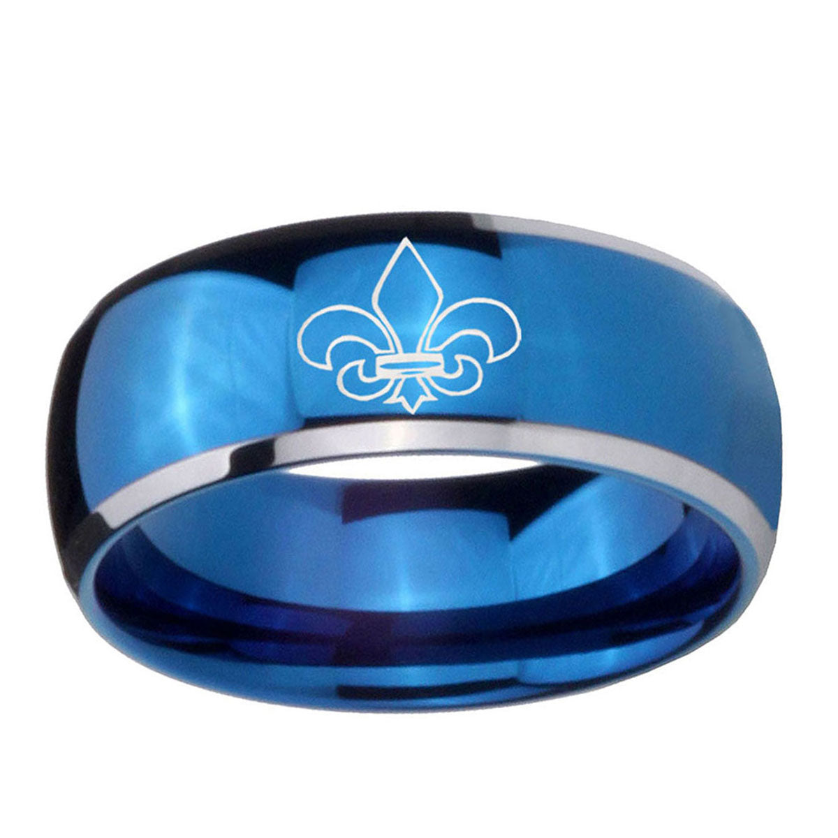 Intruding 5, 8mm Fleur-De-Lis Dome Blue 2 Tone Tungsten Carbide Mens Wedding Band . Offer in both 5mm and 8mm band width polished blue plated 2 tone finished from size 4 to 14