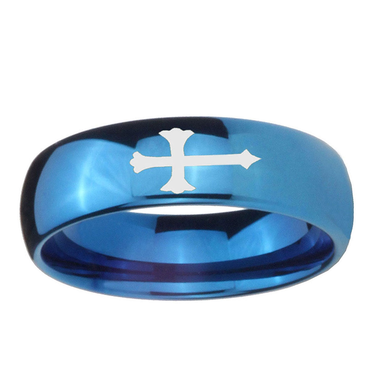 Intruding 5, 8mm Christian Cross Dome Blue Tungsten Carbide Mens Anniversary Ring . Offer in both 5mm and 8mm band width polished blue plated finished from size 4 to 14