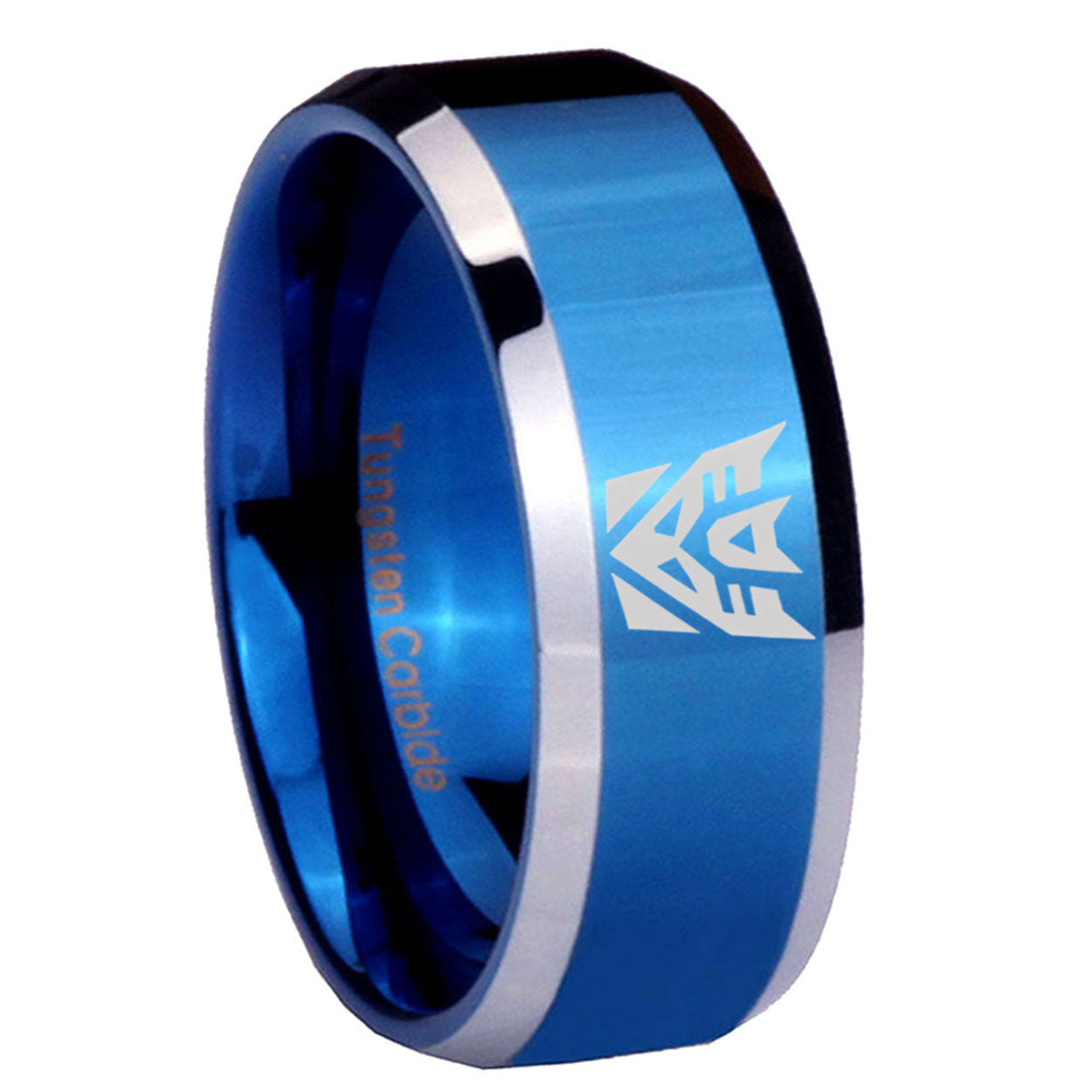 Intruding 5, 8mm Decepticon Transformers Beveled Blue 2 Tone Tungsten Custom Ring for Men . Offer in both 5mm and 8mm band width blue plated 2 tone finished from size 4 to 14