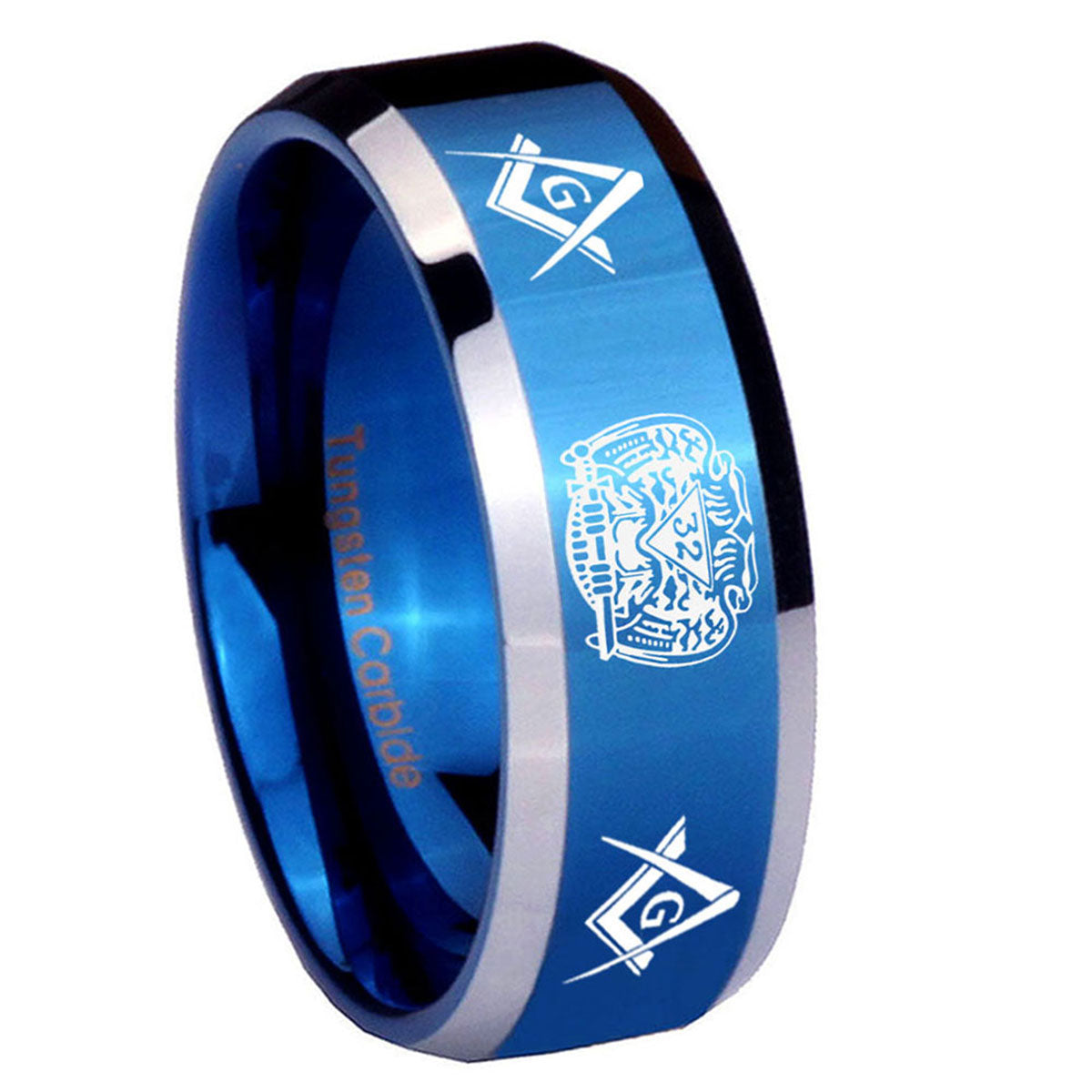 10mm Masonic 32 Design Beveled Edges Blue 2 Tone Tungsten Mens Ring Engraved