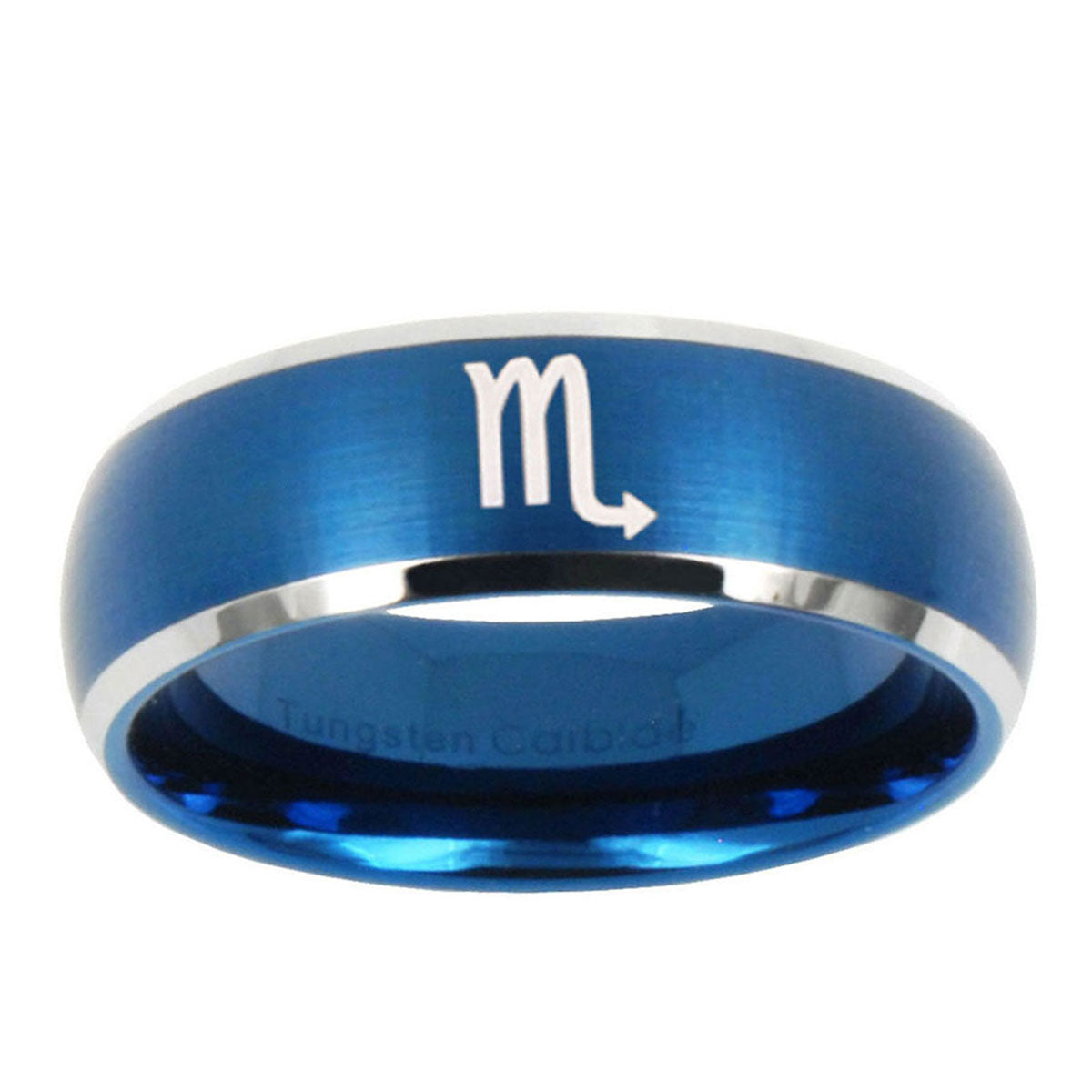 Style the 10mm Scorpio Horoscope Dome Brushed Blue 2 Tone Tungsten Carbide Bands Ring. This blue and black 2-tone dome ring with Scorpio Horoscope design is perfect for men.