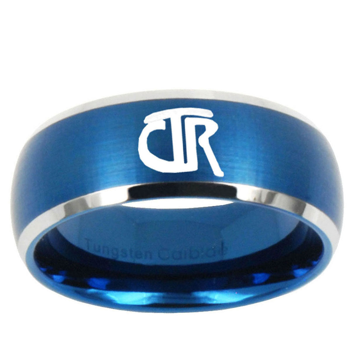 Celebrate with the 10mm CTR Dome Brushed Blue 2 Tone Tungsten Carbide Wedding Bands Ring. This blue and black 2-tone dome ring with CTR design is perfect for weddings.