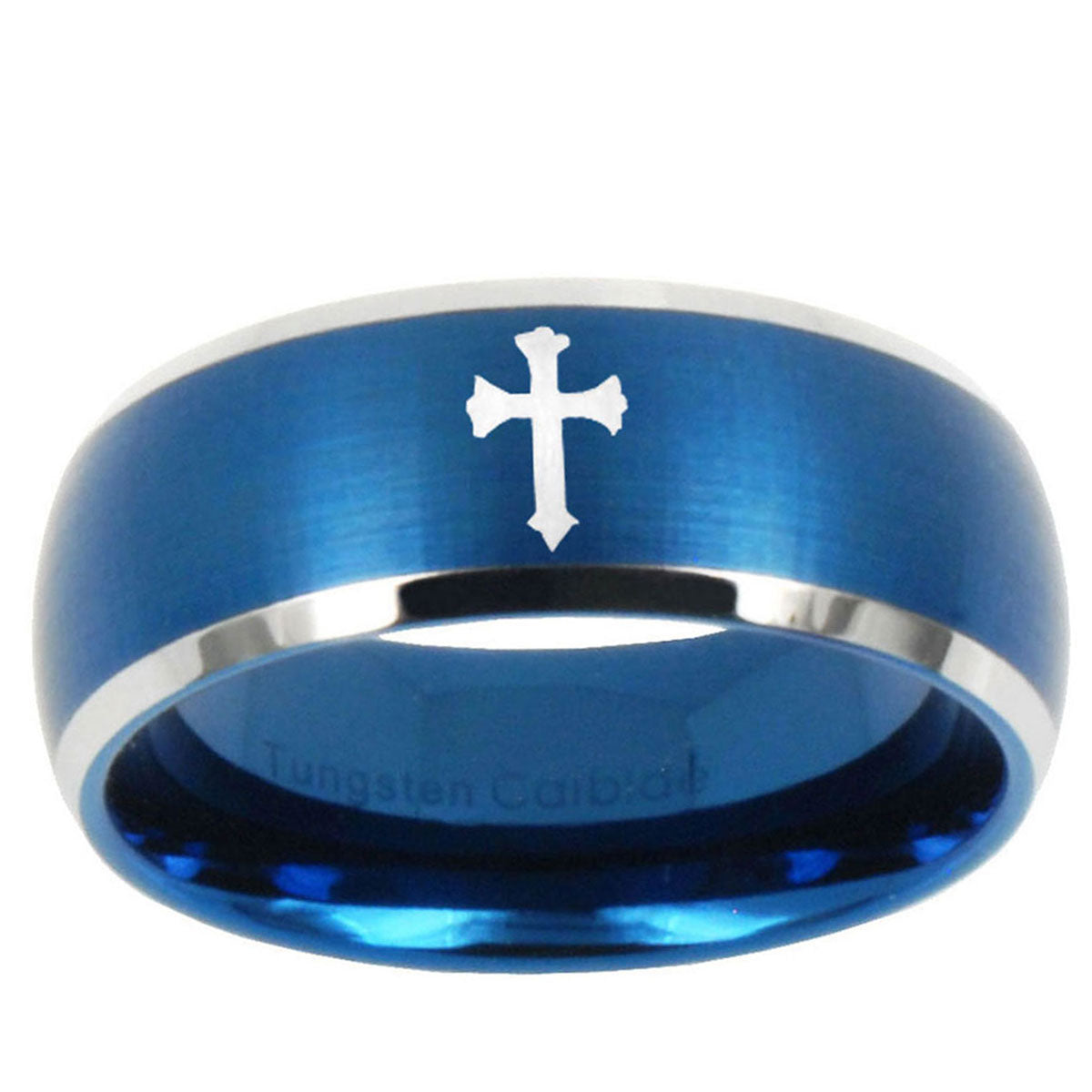 Intruding 5, 8mm Flat Christian Cross Dome Brushed Blue 2 Tone Tungsten Carbide Bands Ring . Offer in both 5mm and 8mm band width brushed blue 2 tone plated finished from size 4 to 14