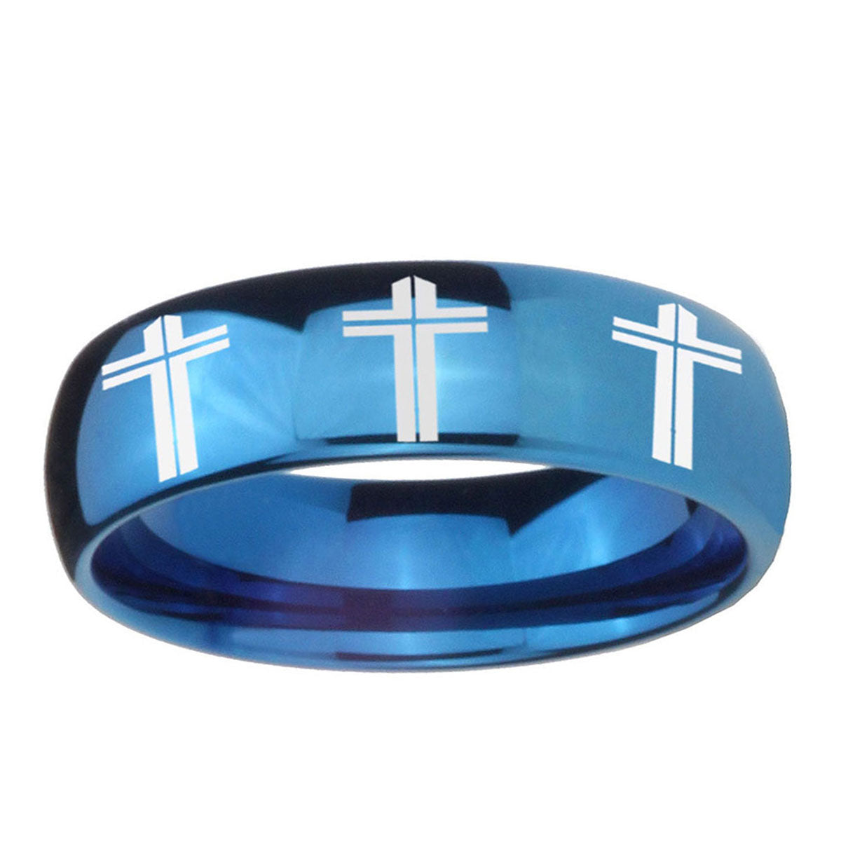 Intruding 5, 8mm Multiple Christian Cross Dome Blue Tungsten Carbide Wedding Band Ring . Offer in both 5mm and 8mm band width polished blue plated finished from size 4 to 14