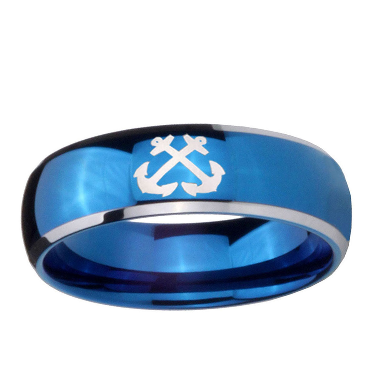 Intruding 5, 8mm Anchor Dome Blue 2 Tone Tungsten Carbide Mens Anniversary Ring . Offer in both 5mm and 8mm band width polished blue plated 2 tone finished from size 4 to 14