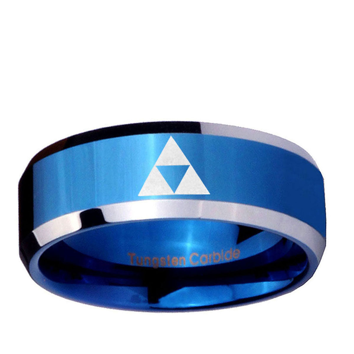 Intruding 5, 8mm Zelda Triforce Beveled Edges Blue 2 Tone Tungsten Carbide Mens Bands Ring . Offer in both 5mm and 8mm band width blue plated 2 tone finished from size 4 to 14