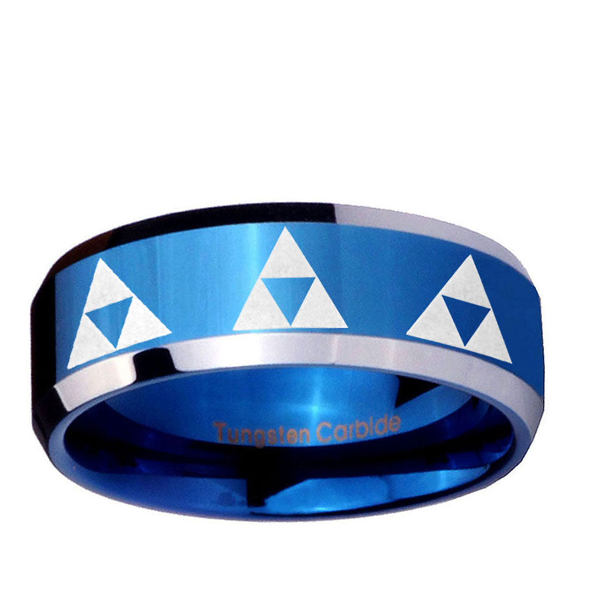 Intruding 5, 8mm Multiple Zelda Triforce Beveled Edges Blue 2 Tone Tungsten Men's Bands Ring . Offer in both 5mm and 8mm band width blue plated 2 tone finished from size 4 to 14