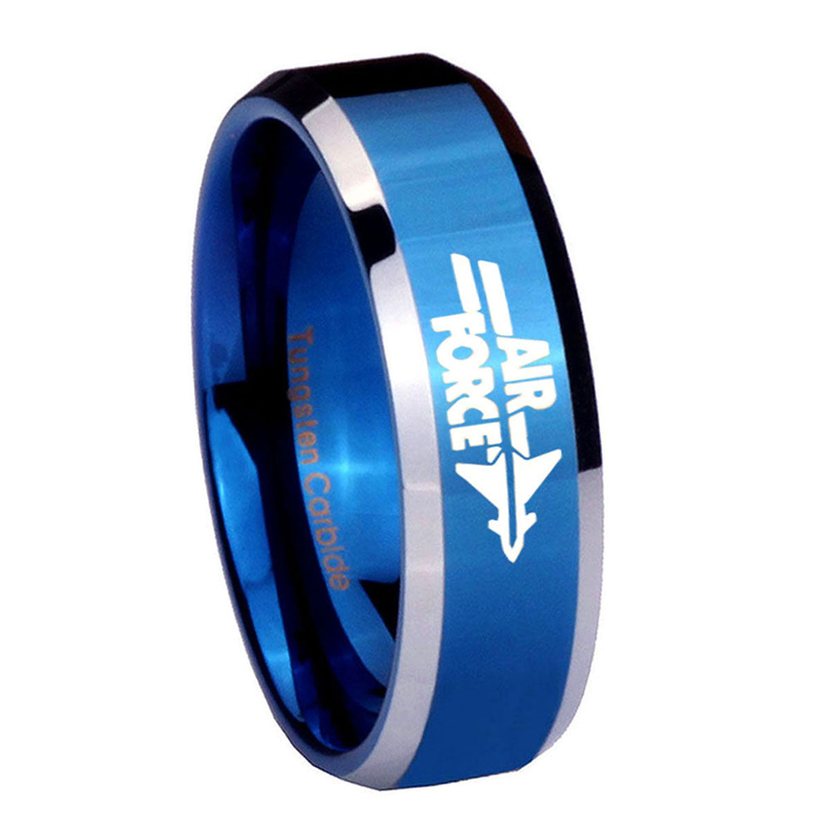 5, 8mm Shiny Blue Air Force Bevel Edges 2 Tone Tungsten Laser Engraved Ring