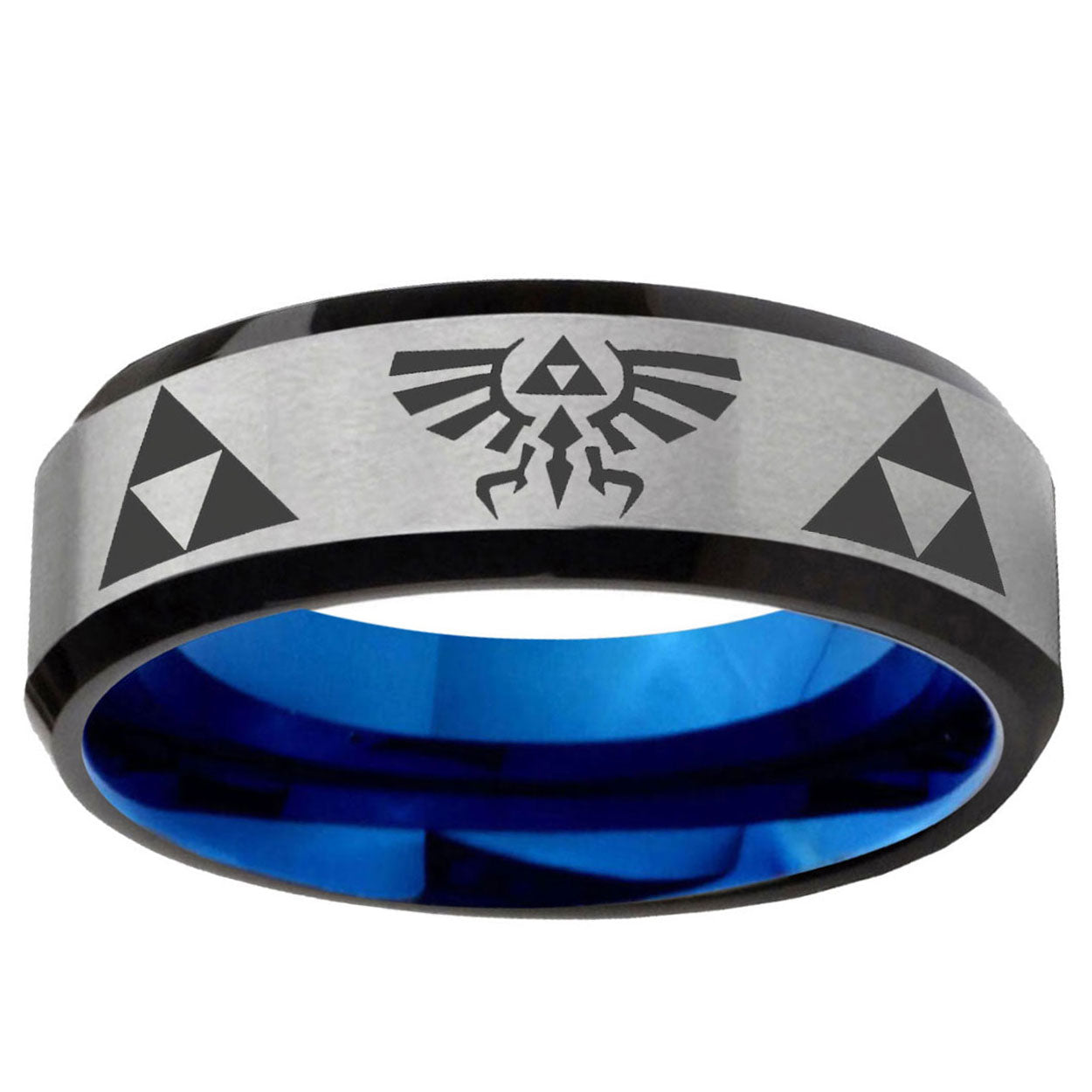 Intruding 6, 8mm Legend Triforce Zelda Beveled Tungsten Carbide Silver Blue Mens Promise Ring . Offer in both 5mm and 8mm band width silver and blue plated finished from size 5 to 14