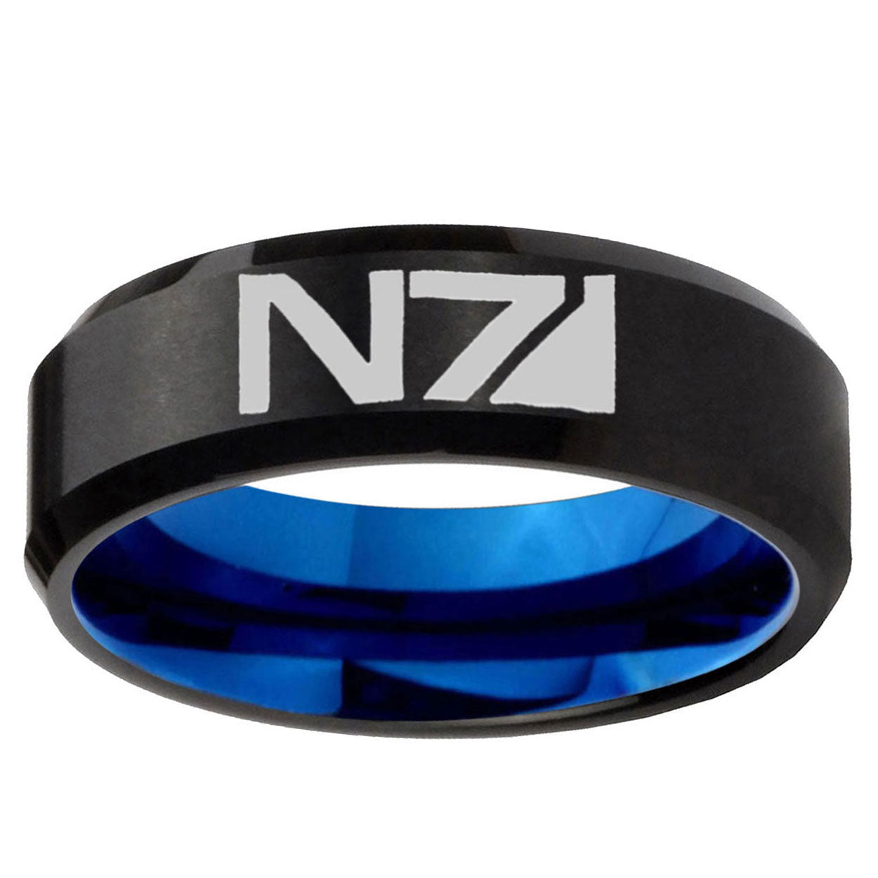 Intruding 5, 8mm N7 Design Bevel Tungsten Carbide Blue Mens Promise Ring . Offer in both 5mm and 8mm band width black and blue plated finished from size 4 to 14