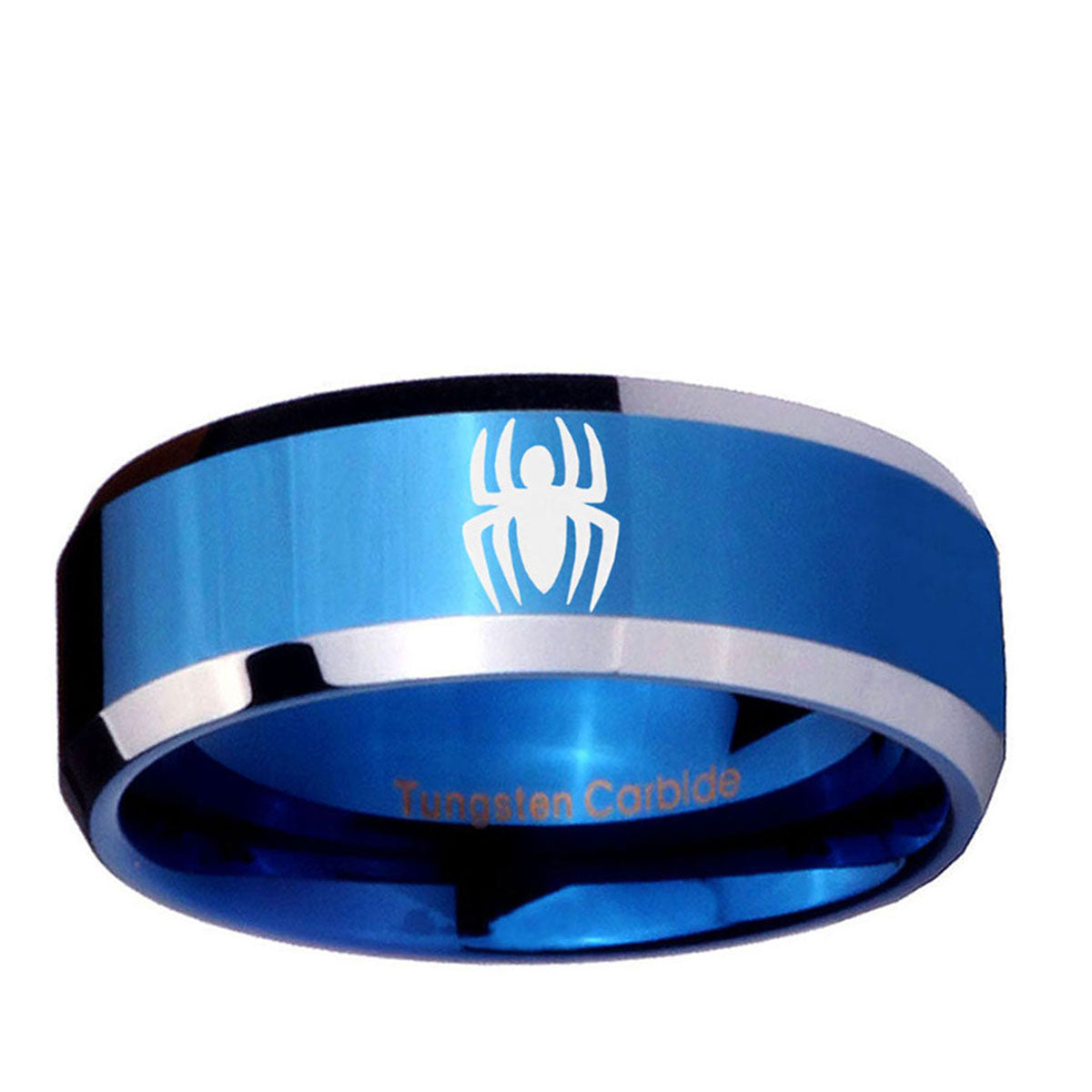 Intruding 5, 8mm Spiderman Beveled Edges Blue 2 Tone Tungsten Carbide Mens Ring Personalized . Offer in both 5mm and 8mm band width blue plated 2 tone finished from size 4 to 14
