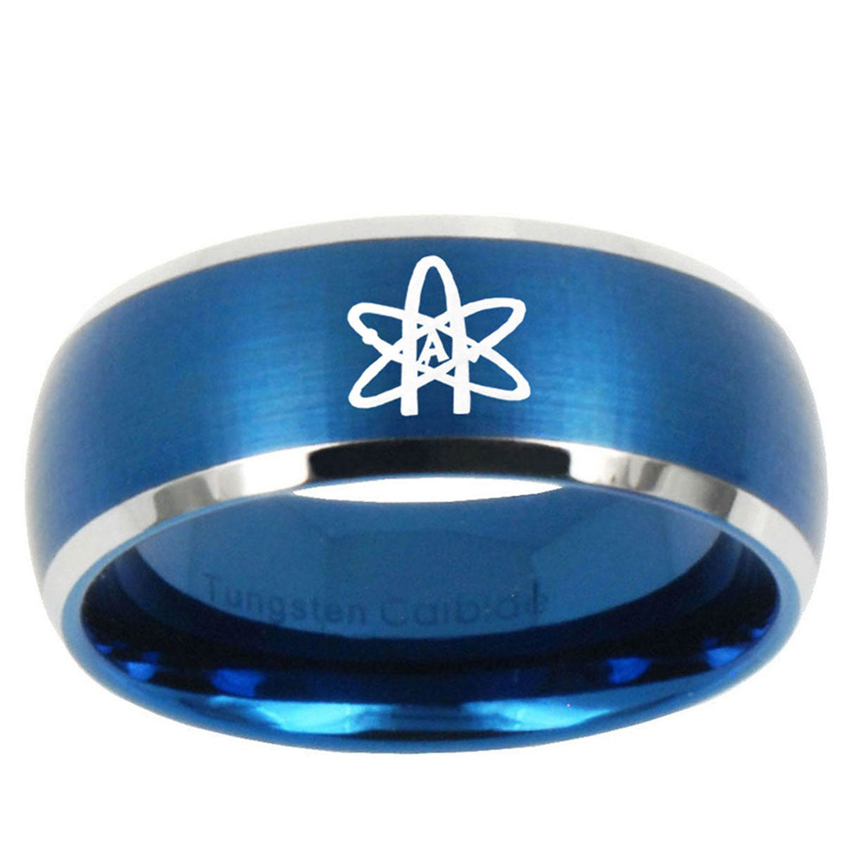 Intruding 5, 8mm American Atheist Dome Brushed Blue 2 Tone Tungsten Carbide Mens Ring . Offer in both 5mm and 8mm band width brushed blue 2 tone plated finished from size 4 to 14