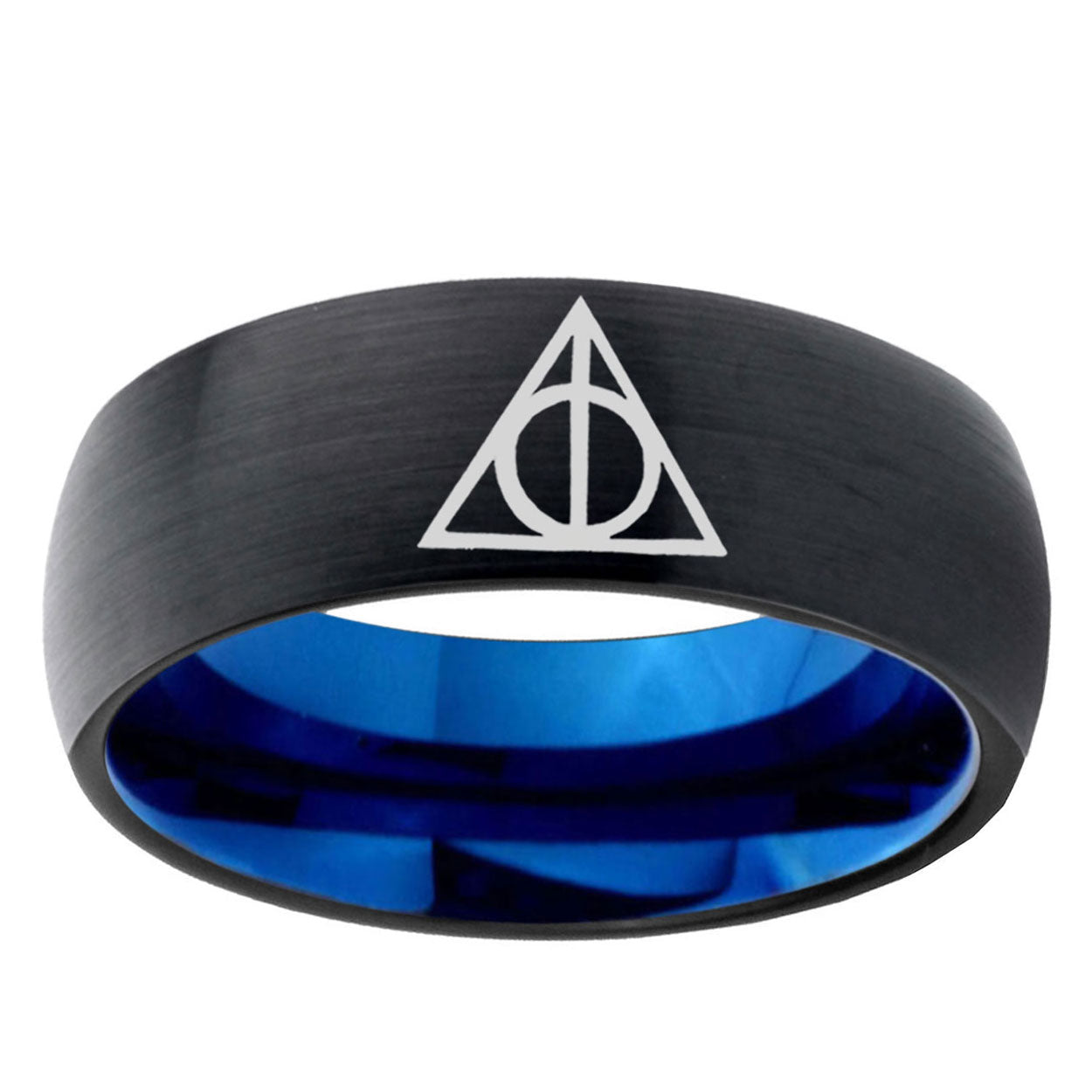 Intruding 5, 8mm Deathly Hallows Dome Tungsten Carbide Blue Custom Ring for Men . Offer in both 5mm and 8mm band width black and blue plated finished from size 4 to 14
