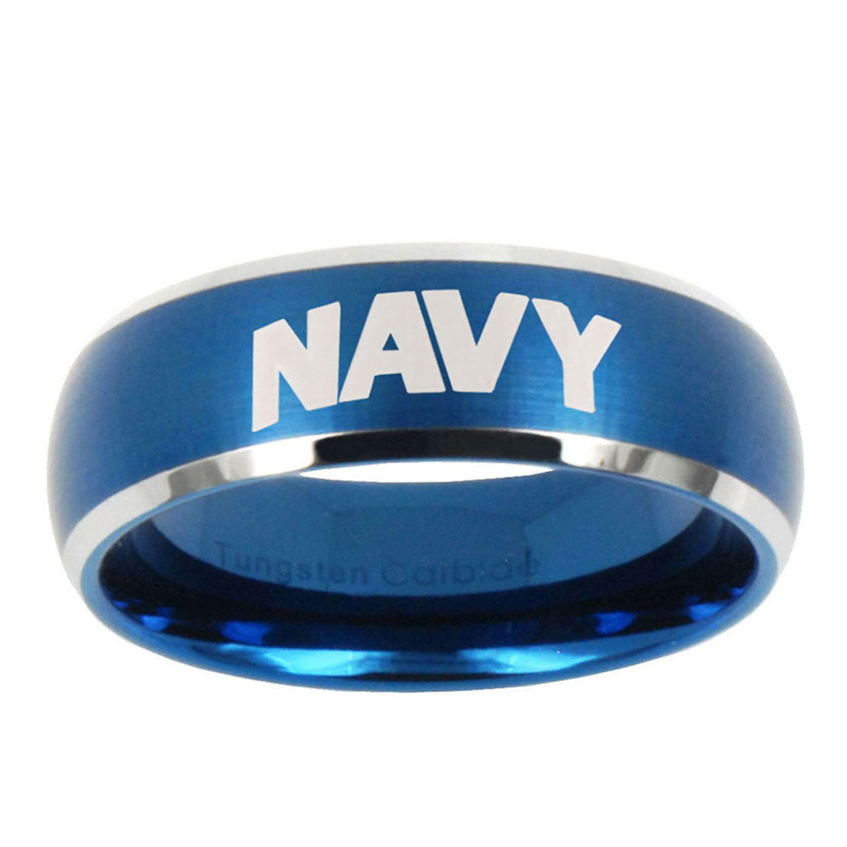 Intruding 5, 8mm Navy Dome Brushed Blue 2 Tone Tungsten Carbide Wedding Engagement Ring . Offer in both 5mm and 8mm band width brushed blue 2 tone plated finished from size 4 to 14