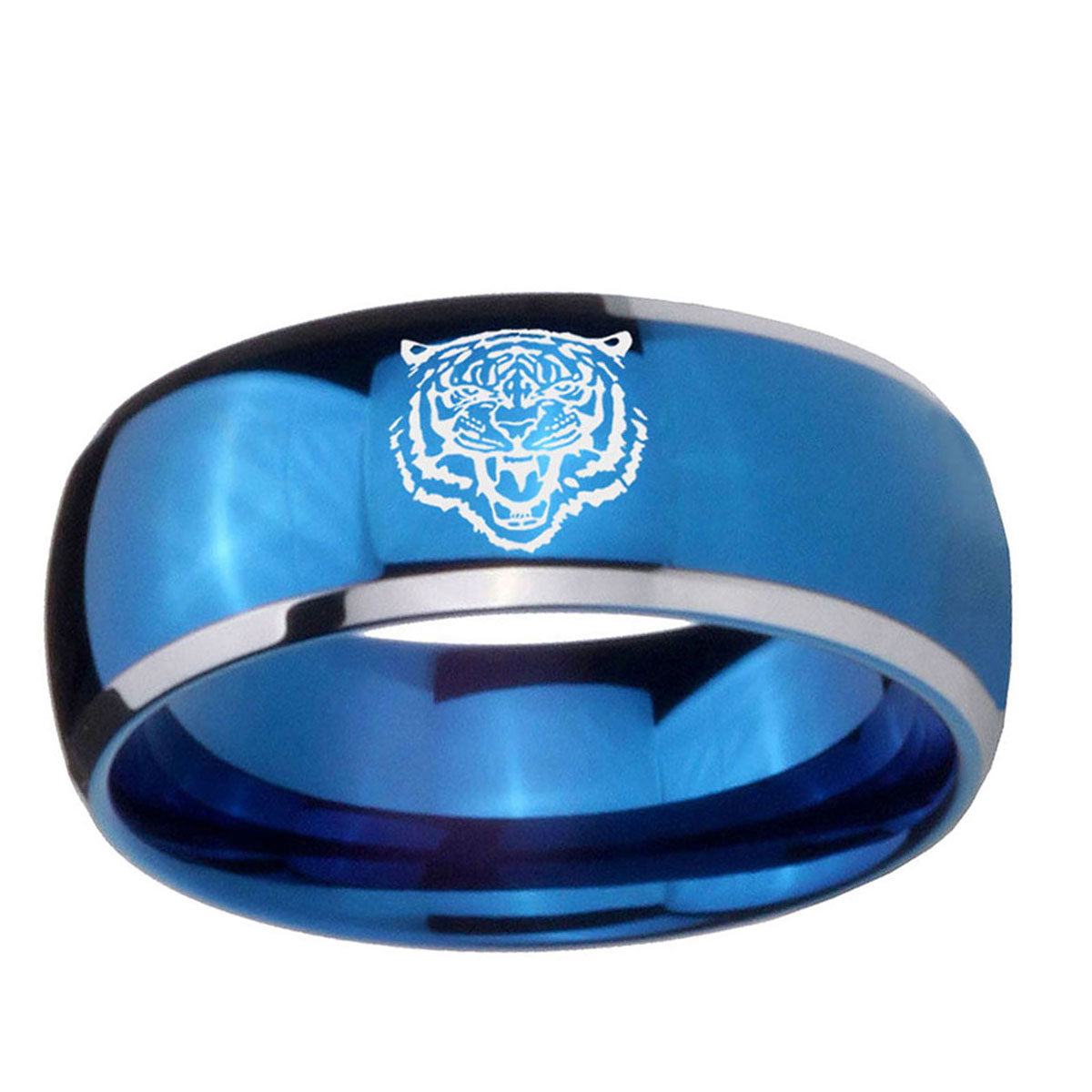 Intruding 5, 8mm Lion Dome Blue 2 Tone Tungsten Carbide Promise Ring . Offer in both 5mm and 8mm band width polished blue plated 2 tone finished from size 4 to 14