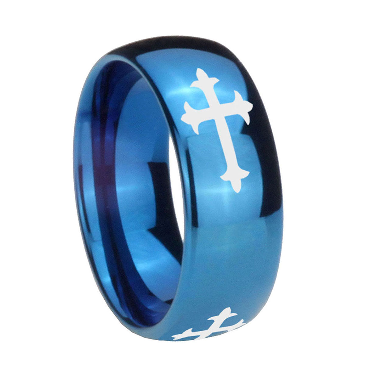 Intruding 5, 8mm Christian Cross Religious Dome Blue Tungsten Carbide Men's Wedding Band . Offer in both 5mm and 8mm band width polished blue plated finished from size 4 to 14