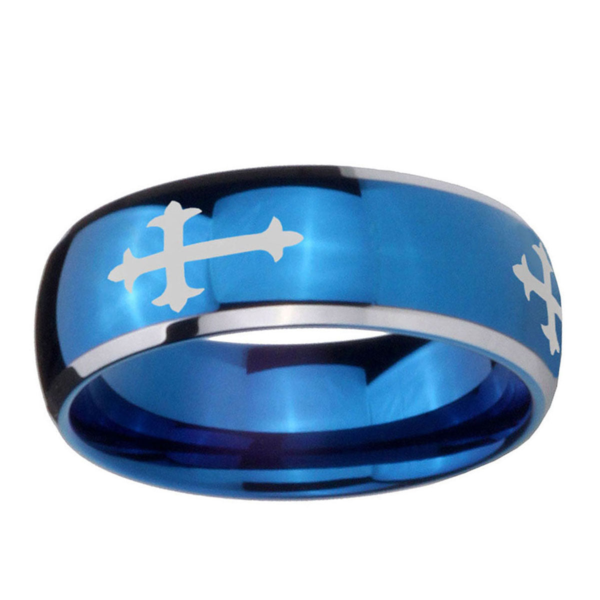 Intruding 5, 8mm Christian Cross Religious Dome Blue 2 Tone Tungsten Carbide Mens Wedding Band . Offer in both 5mm and 8mm band width polished blue plated 2 tone finished from size 4 to 14