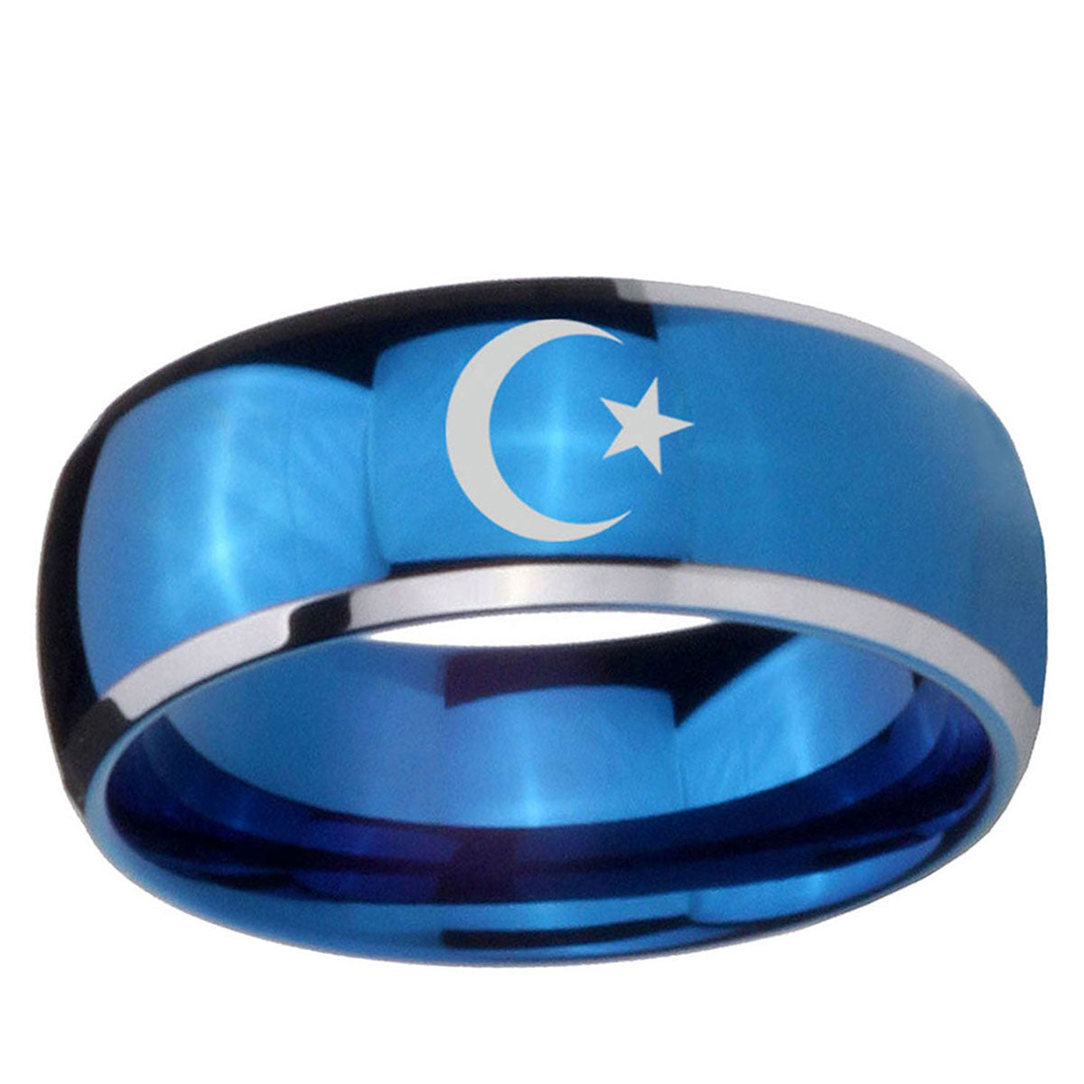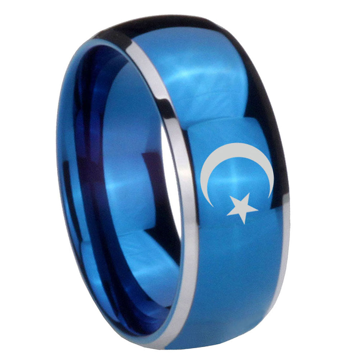 Intruding 5, 8mm Crescent Moon Stars Dome Blue 2 Tone Tungsten Carbide Promise Ring . Offer in both 5mm and 8mm band width polished blue plated 2 tone finished from size 4 to 14