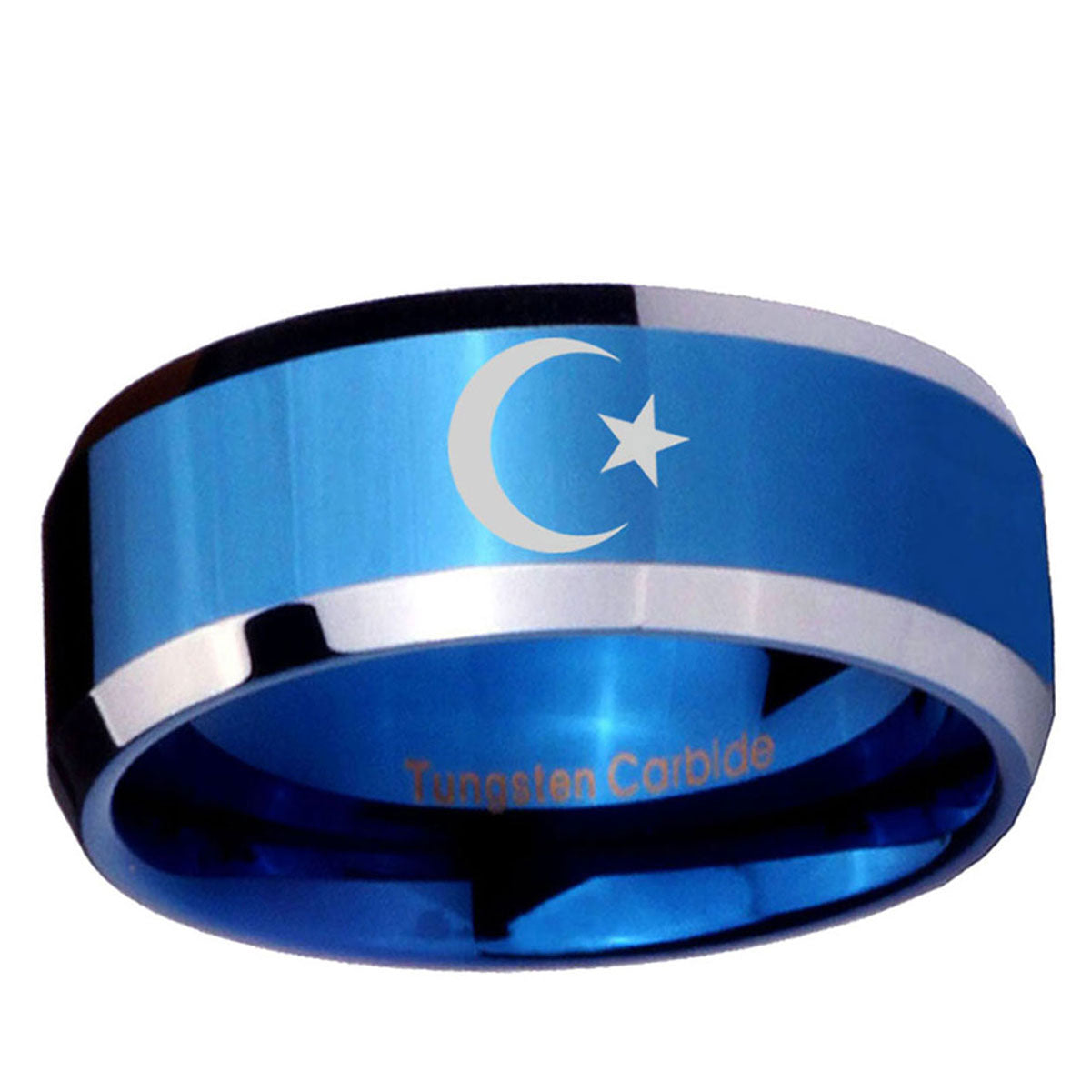 Propose with the 10mm Crescent Moon Stars Beveled Edges Blue 2 Tone Tungsten Men's Engagement Ring. This blue and black 2-tone tungsten ring with Crescent Moon Stars design is ideal for engagements.