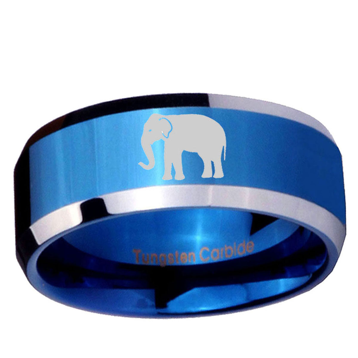 Intruding 5, 8mm Elephant Beveled Edges Blue 2 Tone Tungsten Anniversary Ring . Offer in both 5mm and 8mm band width blue plated 2 tone finished from size 4 to 14