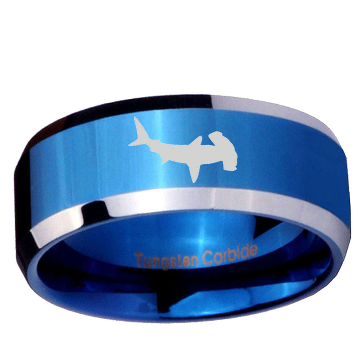 Intruding 5, 8mm Hammerhead Shark Beveled Edges Blue 2 Tone Tungsten Anniversary Ring . Offer in both 5mm and 8mm band width blue plated 2 tone finished from size 4 to 14
