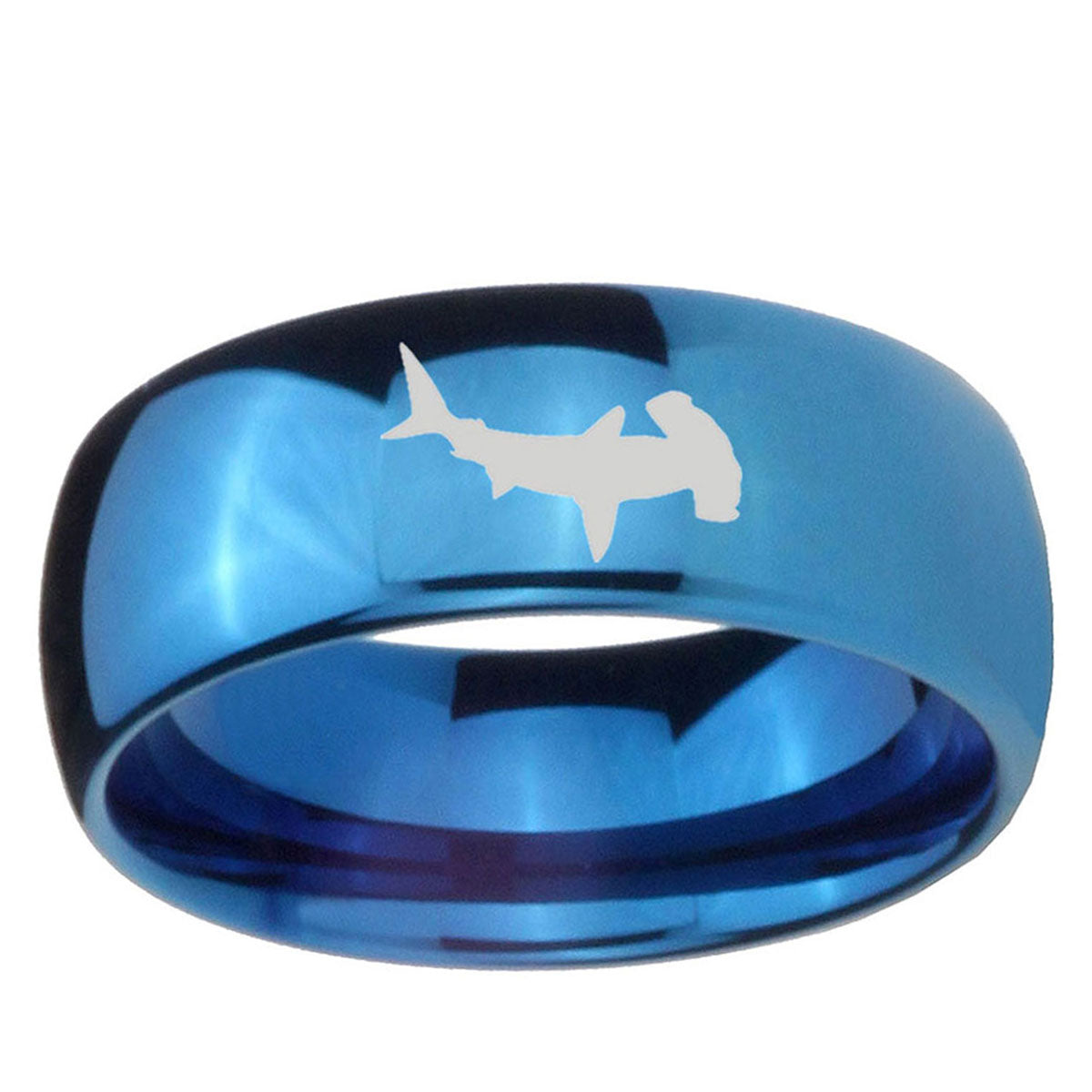 Intruding 5, 8mm Hammerhead Shark Dome Blue Tungsten Carbide Men's Wedding Band . Offer in both 5mm and 8mm band width polished blue plated finished from size 4 to 14