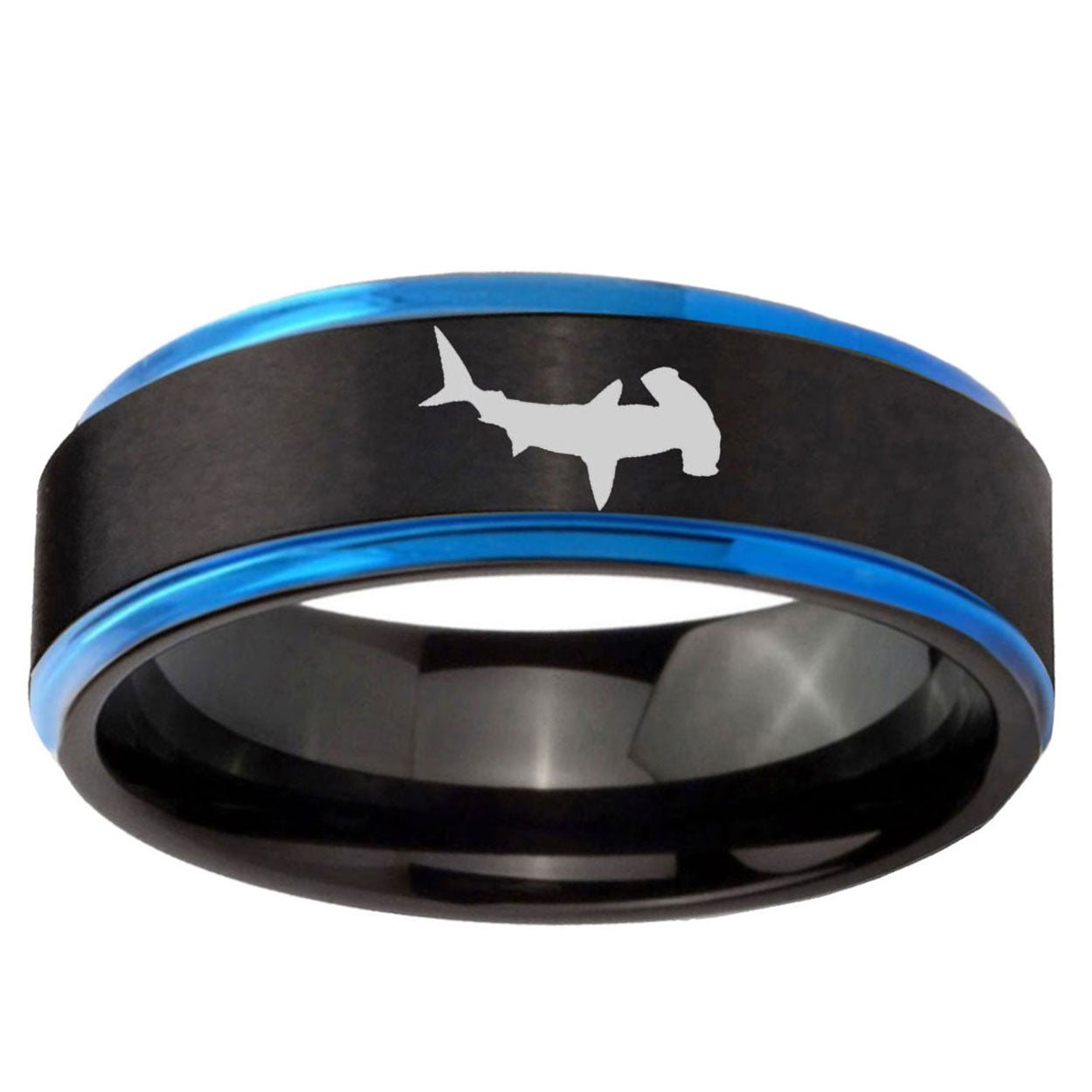 Make a promise with the 10mm Hammerhead Shark Blue Step Edges Brushed Tungsten Carbide Mens Promise Ring. This brushed blue tungsten ring with Hammerhead Shark design is perfect for commitments.