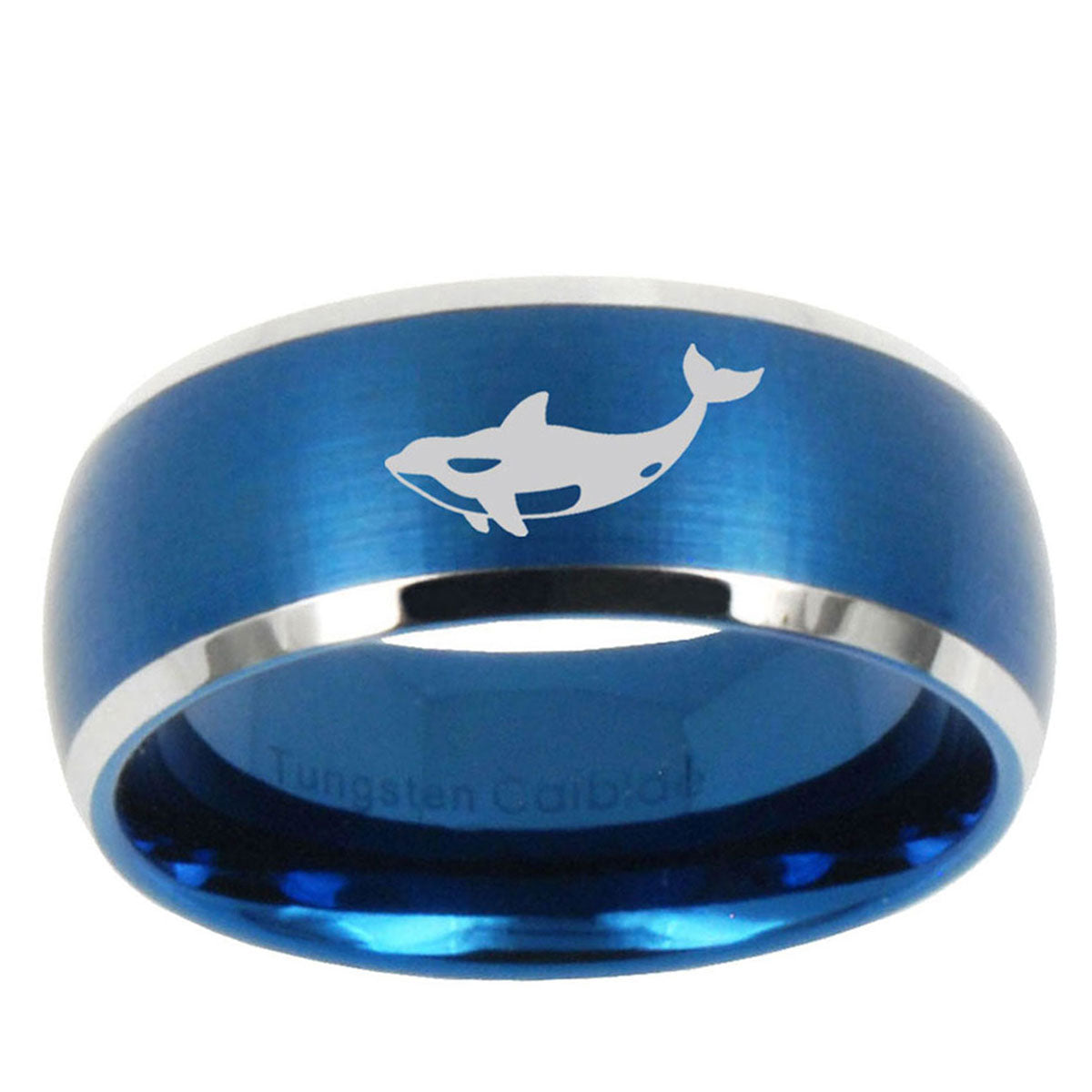 Celebrate with the 10mm Keller Whale Dome Brushed Blue 2 Tone Tungsten Mens Wedding Band. This blue and black 2-tone dome ring with Keller Whale design is perfect for weddings.