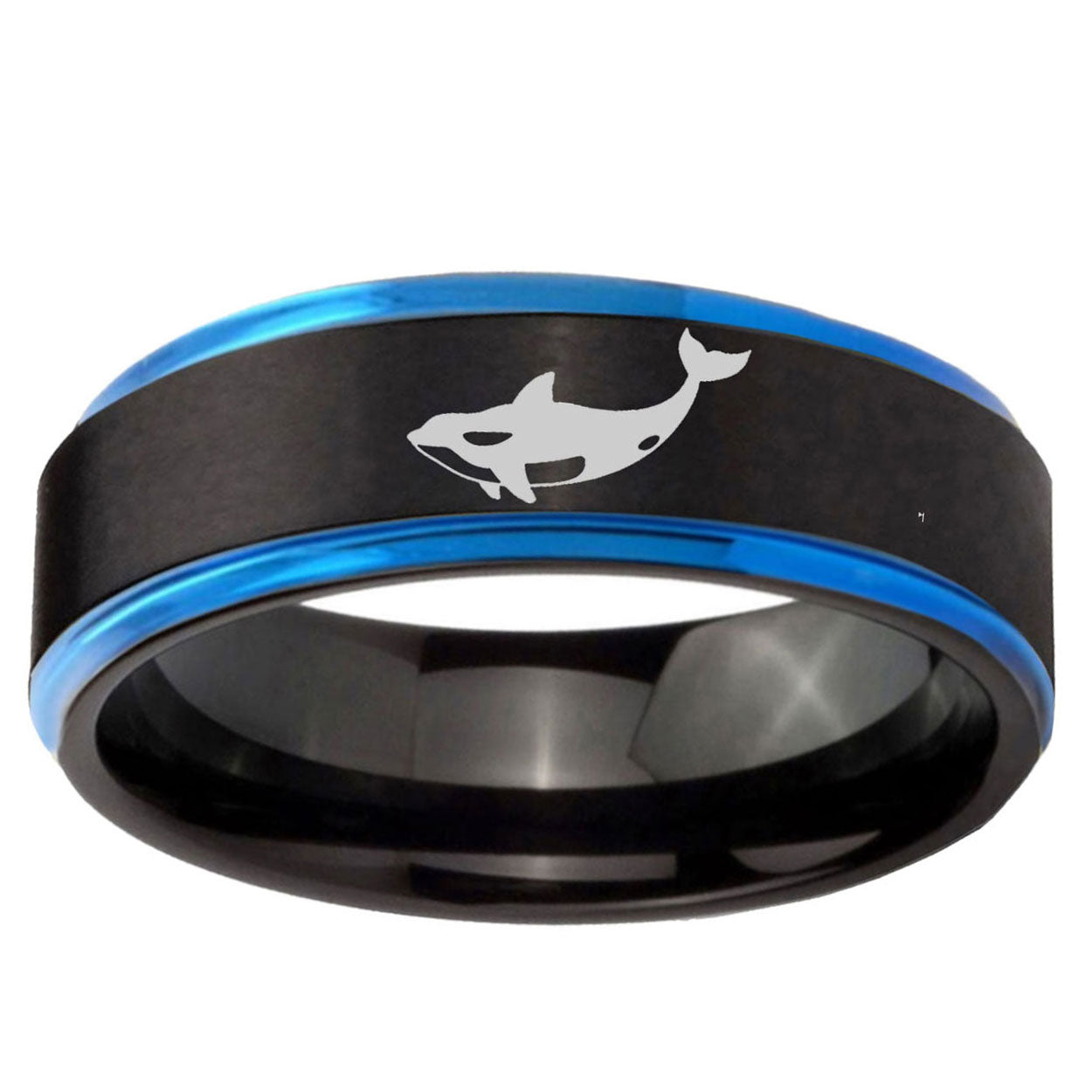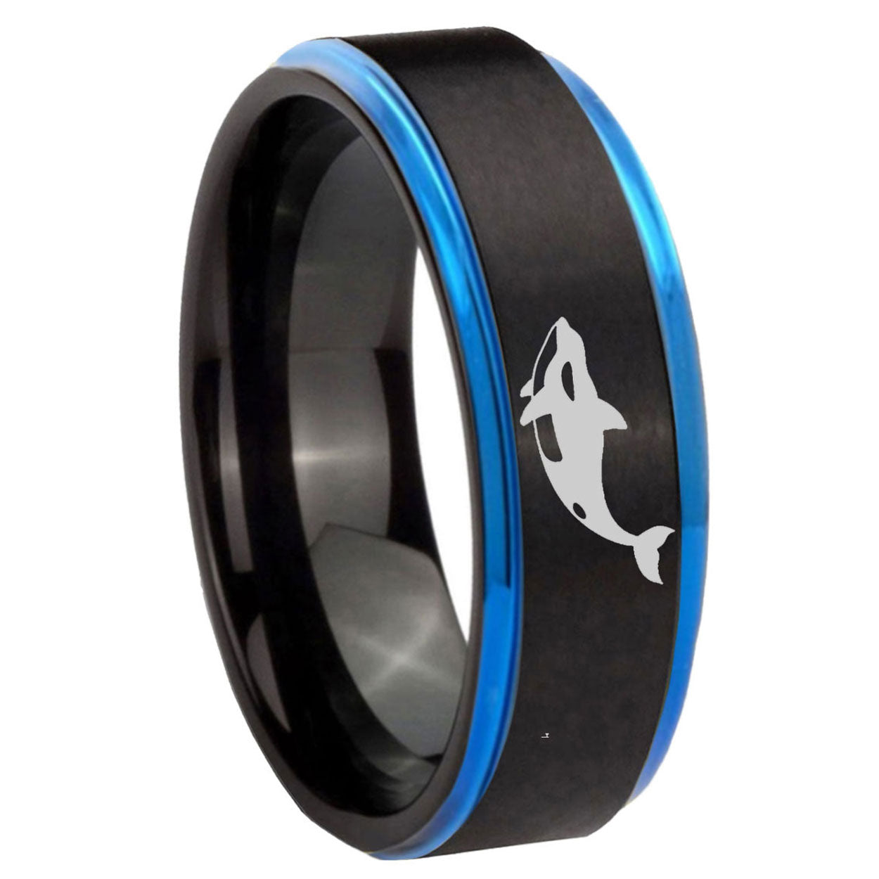 Make a promise with the 10mm Keller Whale Blue Step Edges Brushed Tungsten Carbide Mens Promise Ring. This brushed blue tungsten ring with Keller Whale design is ideal for commitments.