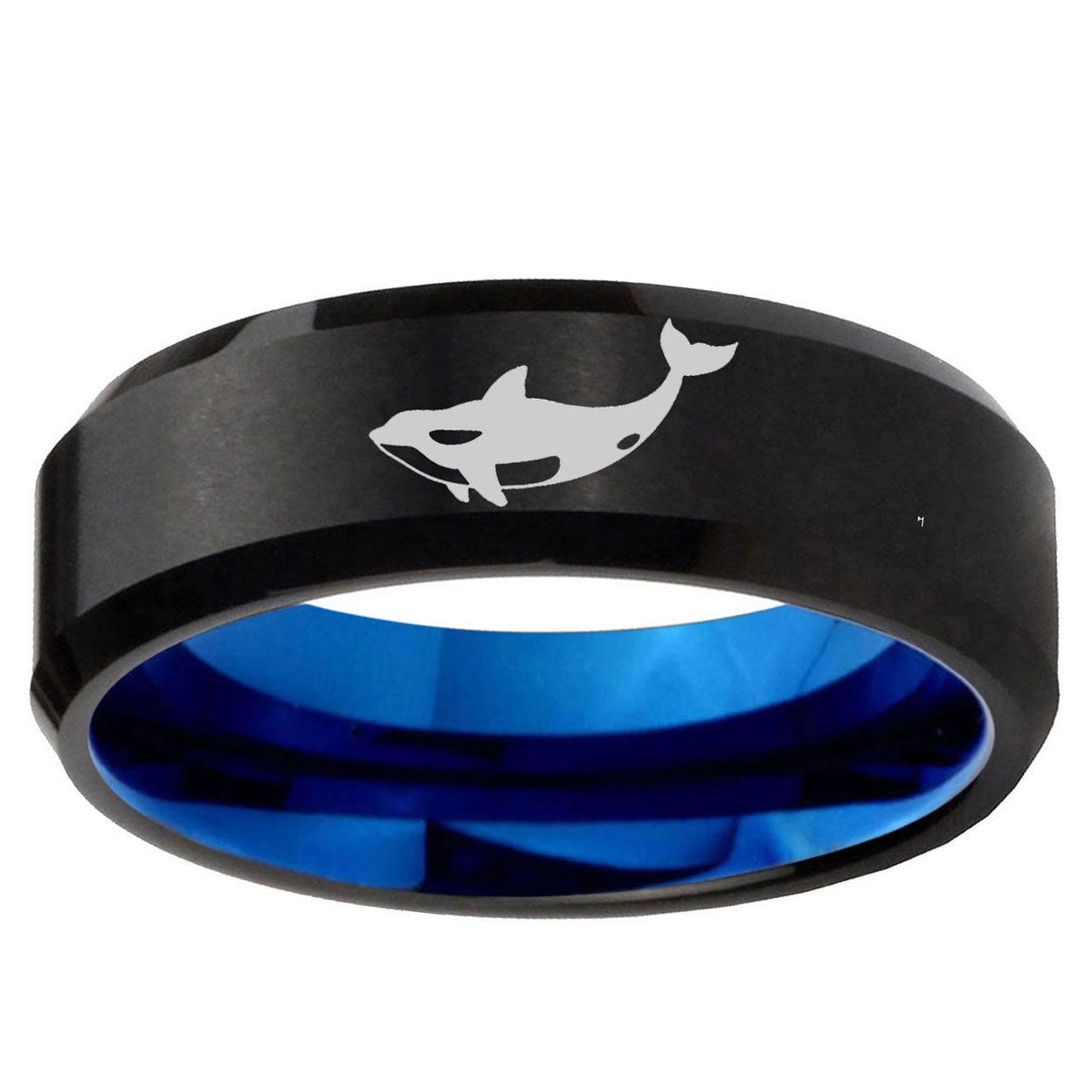 Celebrate ocean love with the 10mm Keller Whale Bevel Tungsten Carbide Blue Wedding Ring. This blue tungsten ring with Keller Whale design is perfect for weddings.
